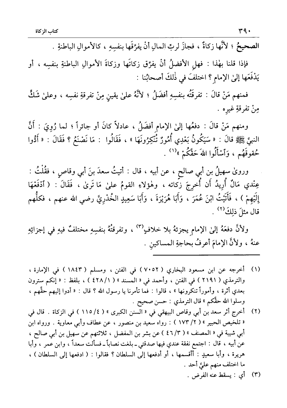 ومنهم من قال: دفعها إلى الإمام أفضل، عادلًا كان أو جائرًا؛ لما روي: أن النبي - صَلَّى اللَّهُ عَلَيْهِ وَسَلَّمَ - قال: «سيكون بعدي أمور تنكرونها "، فقالوا: ما نصنع؟ فقال: " أدوا حقوقهم، واسألوا الله حقكم» .