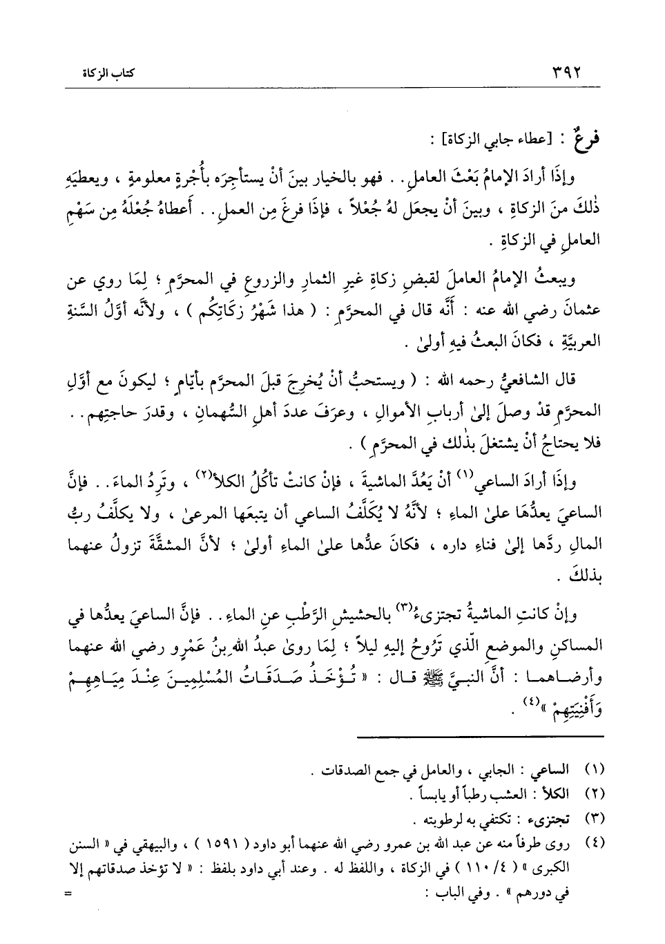وإن كانت الماشية تجتزئ بالحشيش الرطب عن الماء.. فإن الساعي يعدها في المساكن والموضع الذي تروح إليه ليلًا؛ لما روى عبد الله بن عمرو - رَضِيَ اللَّهُ عَنْهُمَا - وأرضاهما: أن النبي - صَلَّى اللَّهُ عَلَيْهِ وَسَلَّمَ - قال: «تؤخذ صدقات المسلمين عند مياههم وأفنيتهم» .