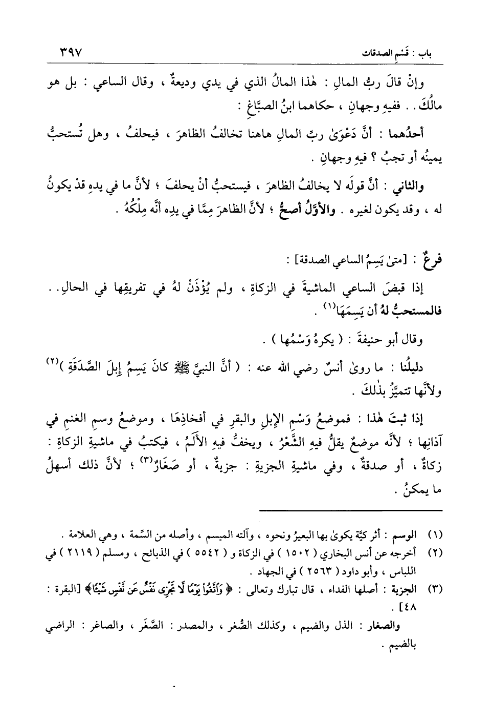 ] : إذا قبض الساعي الماشية في الزكاة، ولم يؤذن له في تفريقها في الحال ... فالمستحب له أن يسمها.