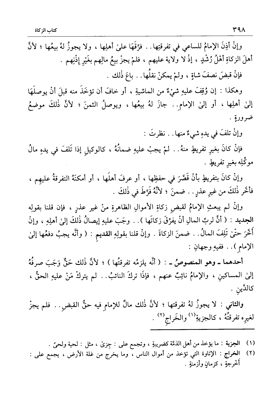 والثاني: لا يجوز له تفرقتها؛ لأن ذلك مال للإمام فيه حق القبض ... فلم يجز لغيره تفرقته، كالجزية والخراج.