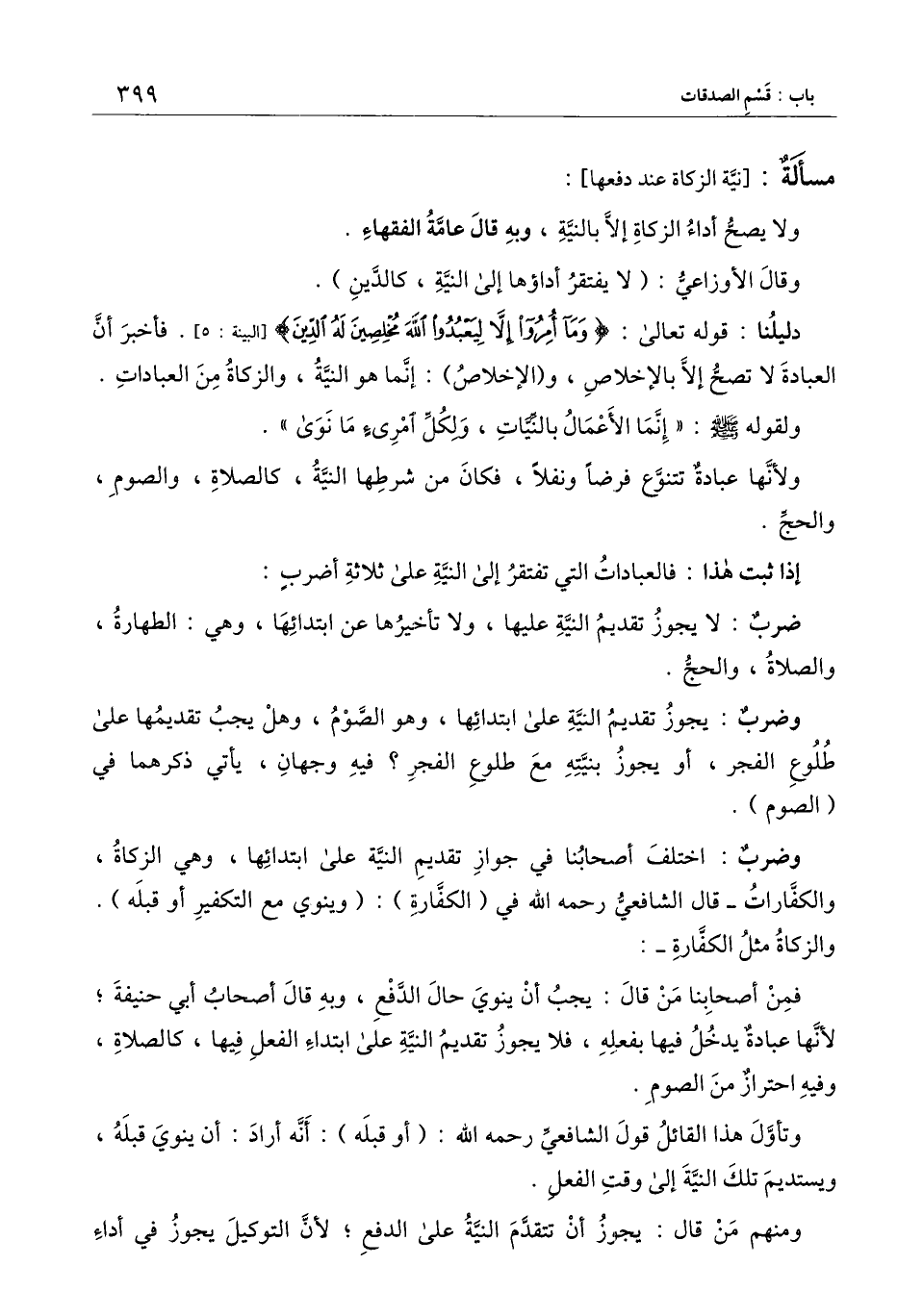 وضرب: اختلف أصحابنا في جواز تقديم النية على ابتدائها، وهي الزكاة، والكفارات - قال الشافعي - رَحِمَهُ اللَّهُ - في (الكفارة) : (وينوي مع التكفير أو قبله) والزكاة مثل الكفارة: