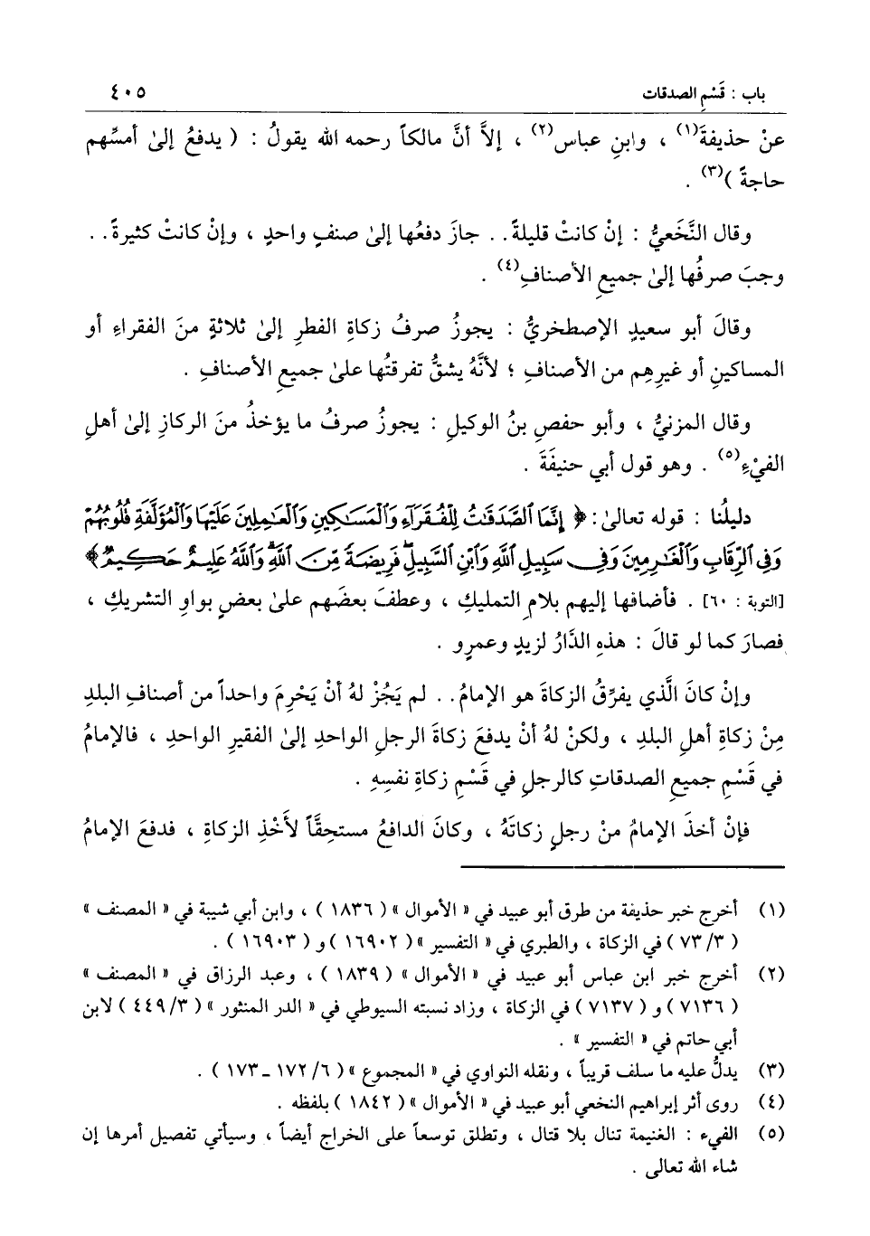 وقال النخعي: إن كانت قليلة.. جاز دفعها إلى صنف واحد، وإن كانت كثيرة.. وجب صرفها إلى جميع الأصناف.