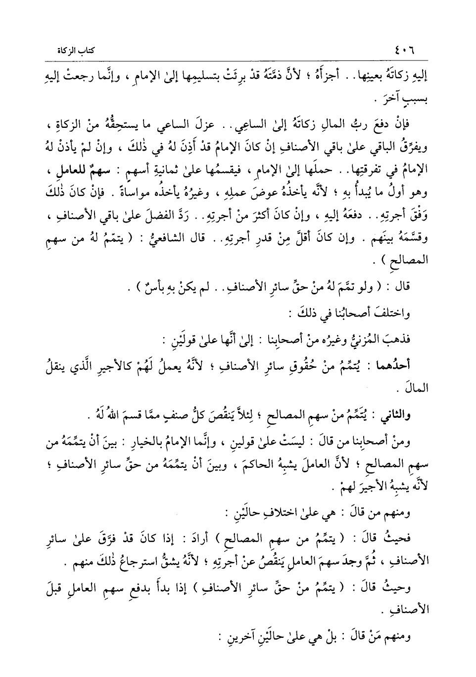ومن أصحابنا من قال: ليست على قولين، وإنما الإمام بالخيار: بين أن يتممه من سهم المصالح؛ لأن العامل يشبه الحاكم، وبين أن يتممه من حق سائر الأصناف؛ لأنه يشبه الأجير لهم.
