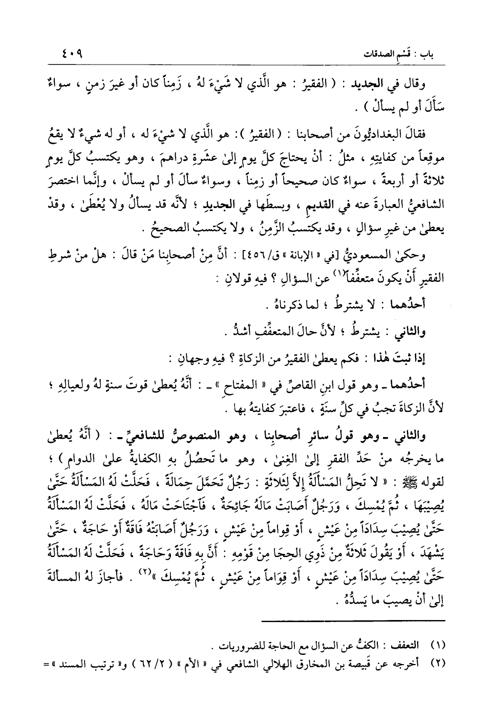فقال البغداديون من أصحابنا: (الفقير) : هو الذي لا شيء له، أو له شيء لا يقع موقعا من كفايته، مثل: أن يحتاج كل يوم إلى عشرة دراهم، وهو يكتسب كل يوم ثلاثة أو أربعة سواء كان صحيحا أو زمنا، وسواء سأل أو لم يسأل، وإنما اختصر الشافعي العبارة عنه في القديم، وبسطها في الجديد؛ لأنه قد يسأل ولا يعطى، وقد يعطى من غير سؤال، وقد يكتسب الزمن، ولا يكتسب الصحيح.