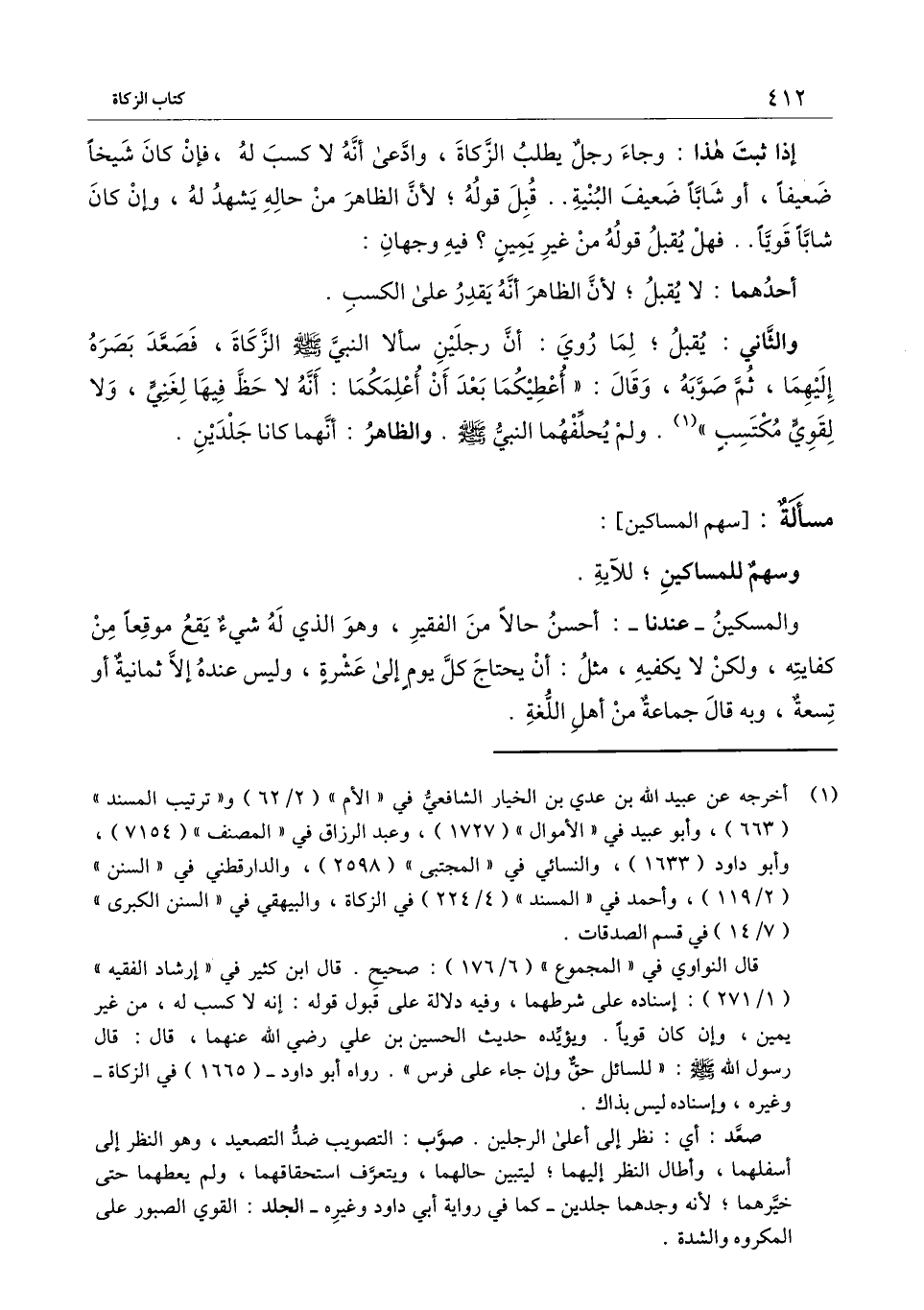 والثاني: يقبل؛ لما روي: «أن رجلين سألا النبي - صَلَّى اللَّهُ عَلَيْهِ وَسَلَّمَ - الزكاة، فصعد بصره إليهما، ثم صوبه، وقال: " أعطيكما بعد أن أعلمكما: أنه لا حظ فيها لغني، ولا لقوي مكتسب» . ولم يحلفهما النبي - صَلَّى اللَّهُ عَلَيْهِ وَسَلَّمَ -. والظاهر: أنهما كانا جلدين.