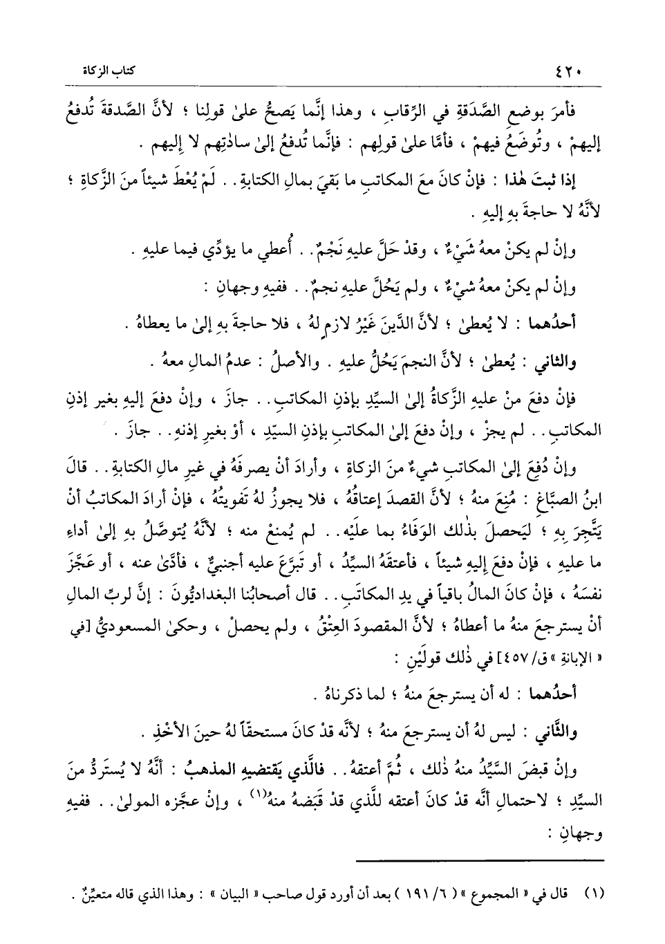 وإن دفع إلى المكاتب شيء من الزكاة، وأراد أن يصرفه في غير مال الكتابة.. قال ابن الصباغ: منع منه؛ لأن القصد إعتاقه، فلا يحوز له تفويته، فإن أراد المكاتب أن يتجر به؛ ليحصل بذلك الوفاء بما عليه.. لم يمنع منه؛ لأنه يتوصل به إلى أداء ما عليه، فإن دفع إليه شيئا فأعتقه السيد، أو تبرع عليه أجنبي، فأدى عنه، أو عجز نفسه، فإن كان المال باقيا في يد المكاتب.. قال أصحابنا البغداديون: إن لرب المال أن يسترجع منه ما أعطاه؛ لأن المقصود العتق، ولم يحصل، وحكى المسعودي [في " الإبانة " ق\ 457] في ذلك قولين: