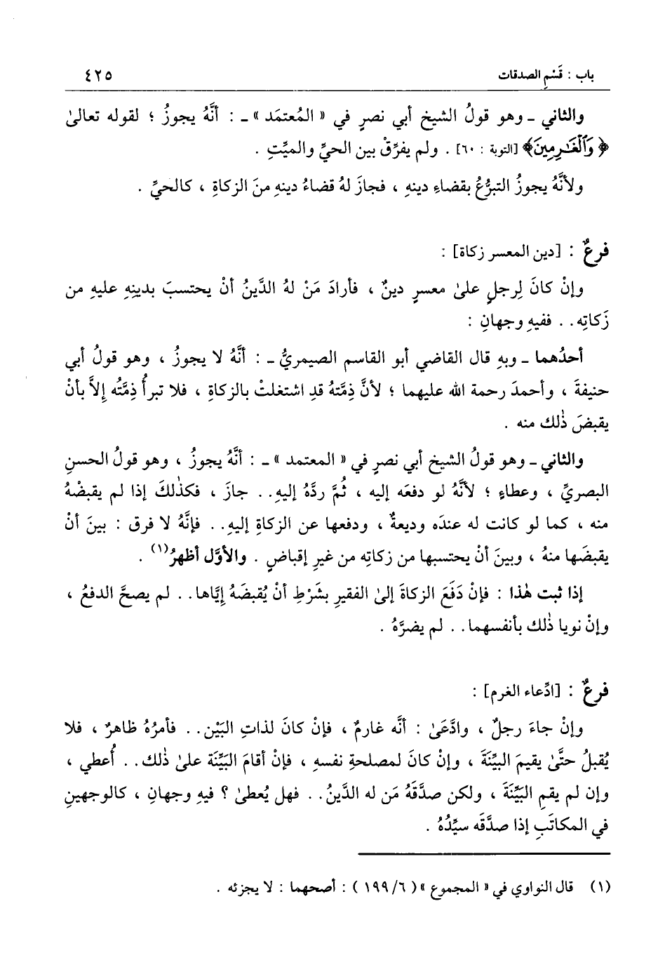 والثاني - وهو قول الشيخ أبي نصر في " المعتمد " - أنه يجوز، وهو قول الحسن البصري، وعطاء؛ لأنه لو دفعه إليه، ثم رده إليه.. جاز، فكذلك إذا لم يقبضه منه، كما لو كانت له عنده وديعة، ودفعها عن الزكاة إليه.. فإنه لا فرق: بين أن يقبضها منه، وبين أن يحتسبها من زكاته من غير إقباض. والأول أظهر.