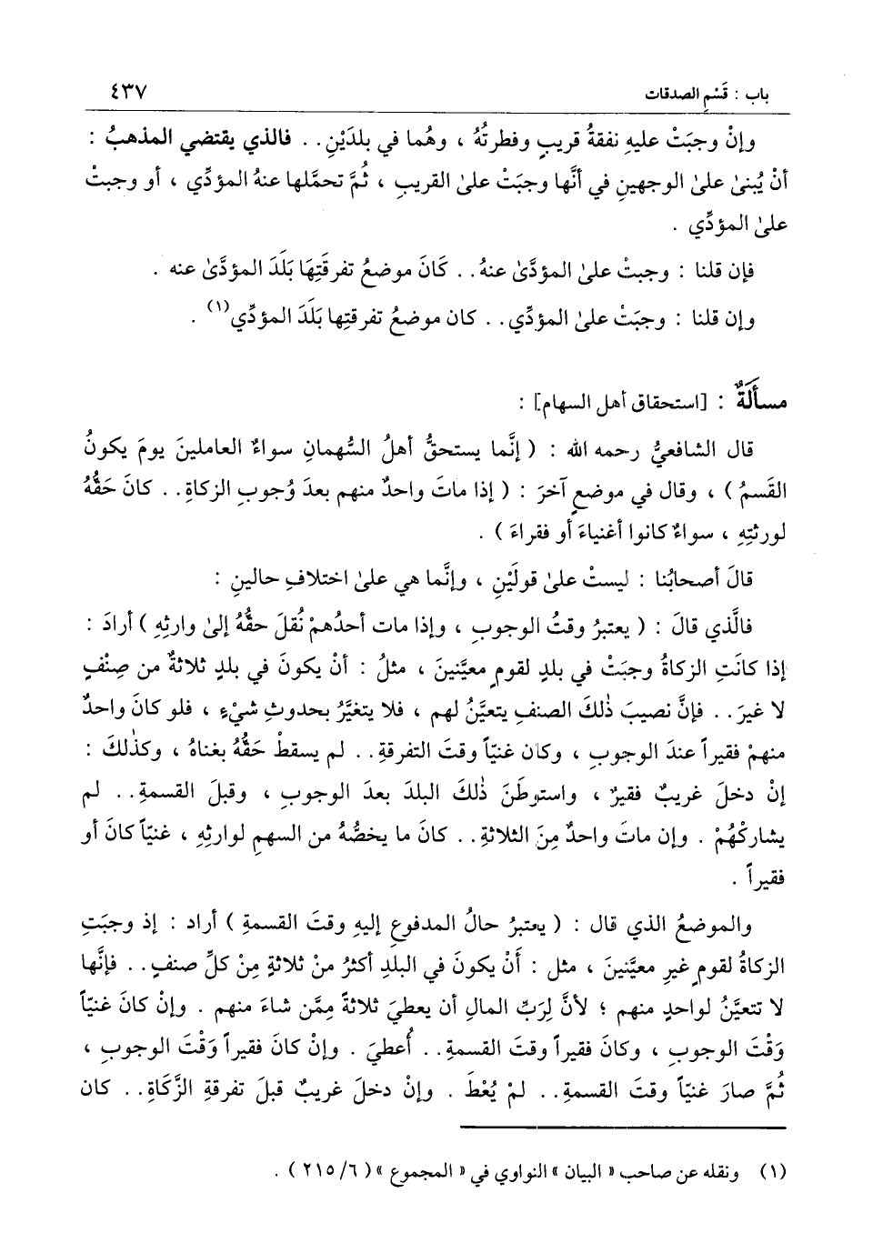 ] : قال الشافعي - رَحِمَهُ اللَّهُ -: (إنما يستحق أهل السهمان سواء العاملين يوم يكون القسم) ، وقال في موضع آخر: (إذا مات واحد منهم بعد وجوب الزكاة.. كان حقه لورثته، سواء كانوا أغنياء أو فقراء) .