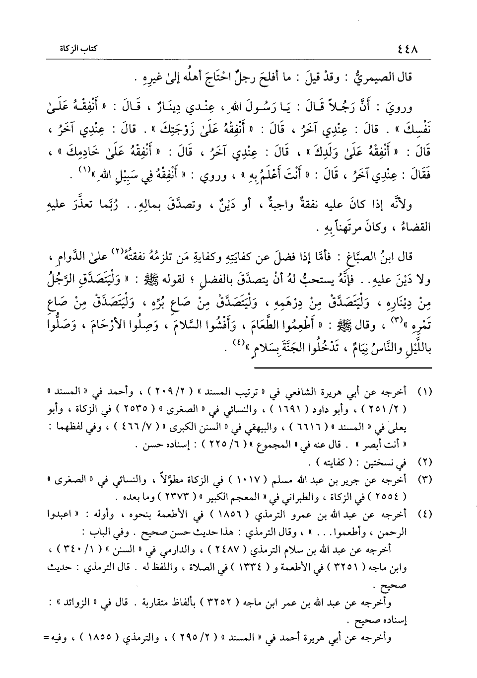 وروي: «أن رجلًا قال: يا رسول الله، عندي دينار، قال: " أنفقه على نفسك ". قال: عندي آخر، قال: " أنفقه على زوجتك ". قال: عندي آخر، قال: " أنفقه على ولدك "، قال: عندي آخر، قال: " أنفقه على خادمك "، فقال: عندي آخر، قال: " أنت أعلم به "، وروي " أنفقه في سبيل الله» .