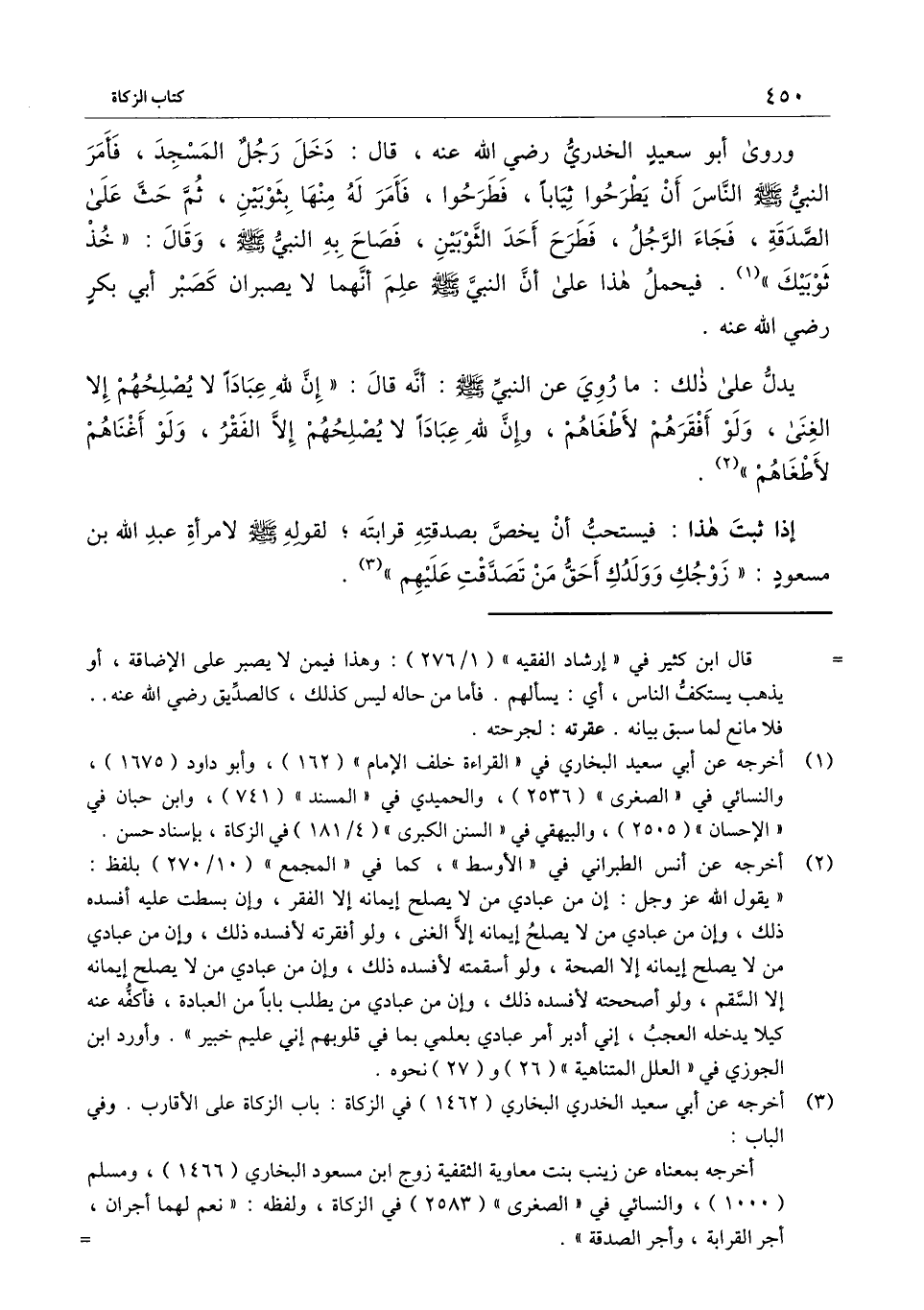 وروى أبو سعيد الخدري - رَضِيَ اللَّهُ عَنْهُ -، قال: «دخل رجل المسجد، فأمر النبي - صَلَّى اللَّهُ عَلَيْهِ وَسَلَّمَ - الناس أن يطرحوا ثيابًا، فطرحوا، فأمر له منها بثوبين، ثم حث على الصدقة، فجاء الرجل، فطرح أحد الثوبين، فصاح به النبي - صَلَّى اللَّهُ عَلَيْهِ وَسَلَّمَ -، وقال: " خذ ثوبيك» . فيحمل هذا على أن النبي - صَلَّى اللَّهُ عَلَيْهِ وَسَلَّمَ - علم أنهما لا يصبران كصبر أبي بكر - رَضِيَ اللَّهُ عَنْهُ -.