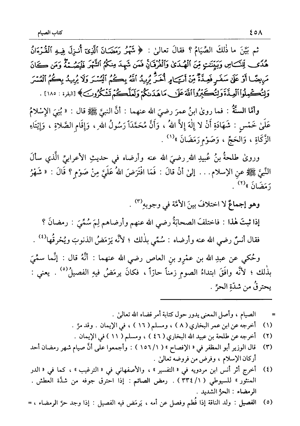 وأما السنة: فما روى ابن عمر - رَضِيَ اللَّهُ عَنْهُمَا -: أن النبي - صَلَّى اللَّهُ عَلَيْهِ وَسَلَّمَ - قال: «بني الإسلام على خمس: شهادة أن لا إله إلا الله، وأن محمدًا رسول الله، وإقام الصلاة، وإيتاء الزكاة، والحج، وصوم رمضان» .