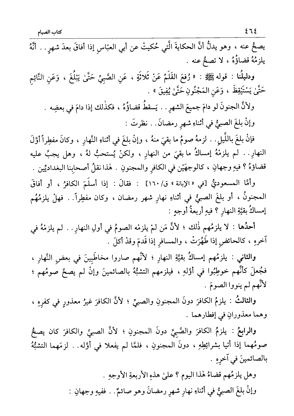 والرابع: يلزم الكافر والصبي دون المجنون؛ لأن الصبي والكافر كان يصح صومهما إذا أتيا بشرائطه، دون المجنون؛ فلما لم يفعلا في أوله.. لزمهما التشبه بالصائمين في آخره.