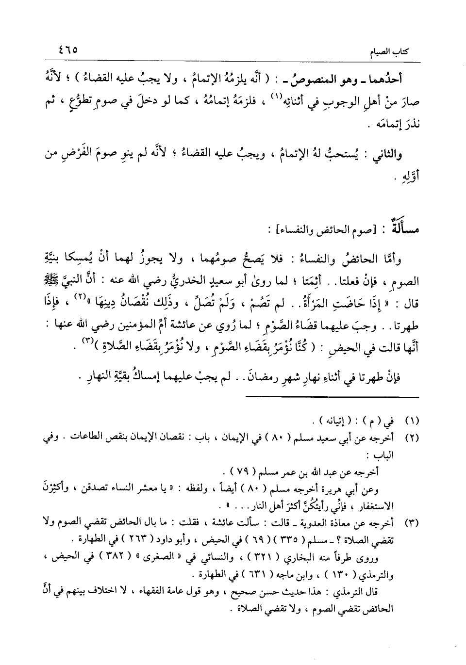 ] : وأما الحائض والنفساء: فلا يصح صومهما، ولا يجوز لهما أن يمسكا بنية الصوم، فإن فعلتا.. أثمتا؛ لما روى أبو سعيد الخدري - رَضِيَ اللَّهُ عَنْهُ -: أن النبي - صَلَّى اللَّهُ عَلَيْهِ وَسَلَّمَ - قال: «إذا حاضت المرأة.. لم تصم، ولم تصل، وذلك نقصان دينها» ، فإذا طهرتا.. وجب عليهما قضاء الصوم؛ لما روي «عن عائشة أم المؤمنين - رَضِيَ اللَّهُ عَنْهَا -: أنها قالت في الحيض: (كنا نؤمر بقضاء الصوم، ولا نؤمر بقضاء الصلاة» .