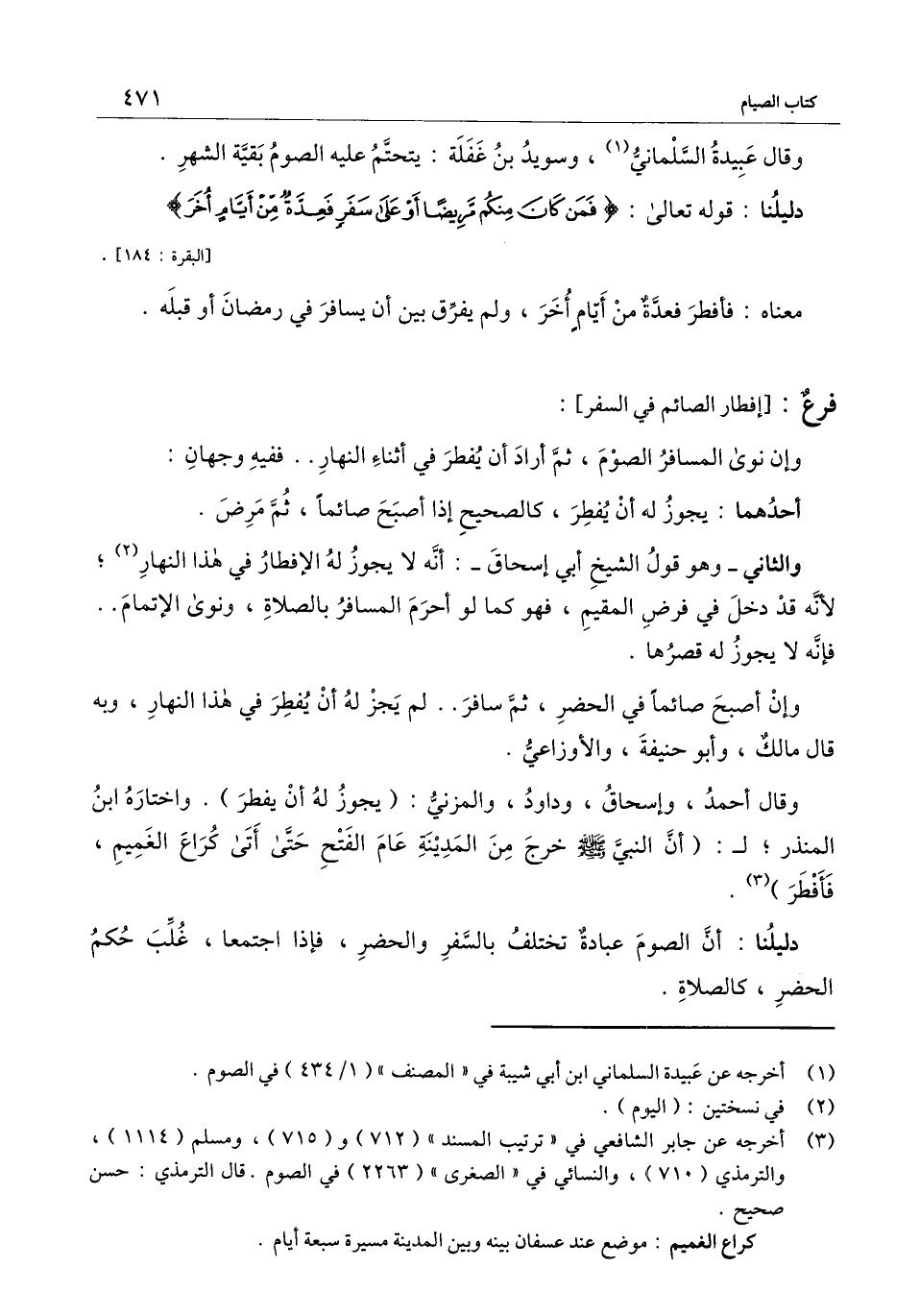وقال أحمد، وإسحاق، وداود، والمزني: (يجوز له أن يفطر) . واختاره ابن المنذر؛ ل: «أن النبي - صَلَّى اللَّهُ عَلَيْهِ وَسَلَّمَ - خرج من المدينة عام الفتح حتى أتى كراع الغميم، فأفطر» دليلنا: أن الصوم عبادة تختلف بالسفر والحضر، فإذا اجتمعا، غلب حكم الحضر، كالصلاة.