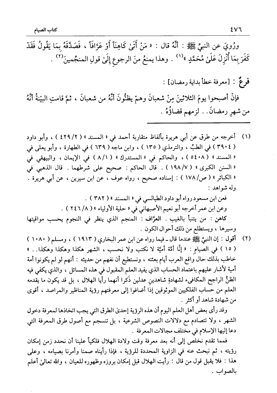 وروي عن النبي - صَلَّى اللَّهُ عَلَيْهِ وَسَلَّمَ -: أنه قال: «من أتى كاهنا أو عرافا، فصدقه بما يقول فقد كفر بما أنزل على محمد» . وهذا يمنع من الرجوع إلى قول المنجمين.