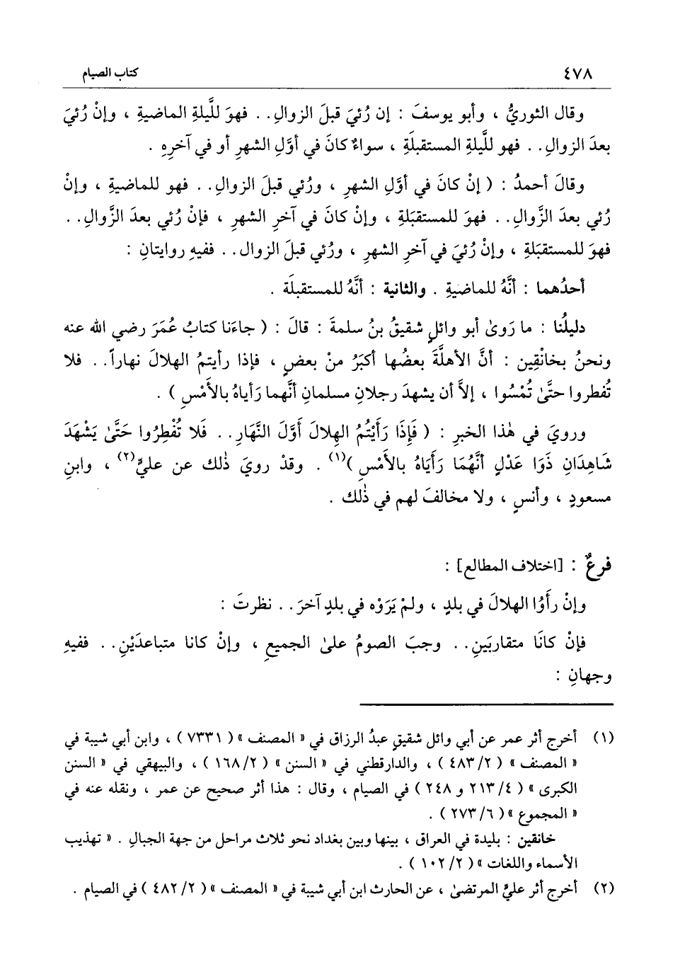 وقال الثوري، وأبو يوسف: إن رئي قبل الزوال.. فهو لليلة الماضية، وإن رئي بعد الزوال.. فهو لليلة المستقبلة، سواء كان في أول الشهر أو في آخره.