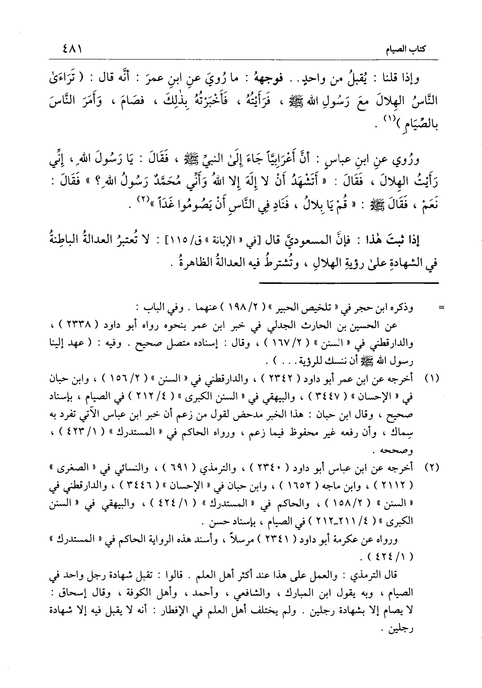 وإذا قلنا: يقبل من واحد.. فوجهه: ما روي عن ابن عمر: أنه قال: «تراءى الناس الهلال مع رسول الله - صَلَّى اللَّهُ عَلَيْهِ وَسَلَّمَ -، فرأيته، فأخبرته بذلك، فصام، وأمر الناس بالصيام» وروي عن ابن عباس: «أن أعرابيًا جاء إلى النبي - صَلَّى اللَّهُ عَلَيْهِ وَسَلَّمَ - فقال: يا رسول الله، إني رأيت الهلال، فقال: أتشهد أن لا إله إلا الله وأني محمد رسول الله. فقال: نعم، فقال - صَلَّى اللَّهُ عَلَيْهِ وَسَلَّمَ -: قم يا بلال، فناد في الناس أن يصوموا غدًا» إذا ثبت هذا: فإن المسعودي قال [الإبانة \ ق، 115] : لا تعتبر العدالة الباطنة في الشهادة على رؤية الهلال، وتشترط فيه العدالة الظاهرة.