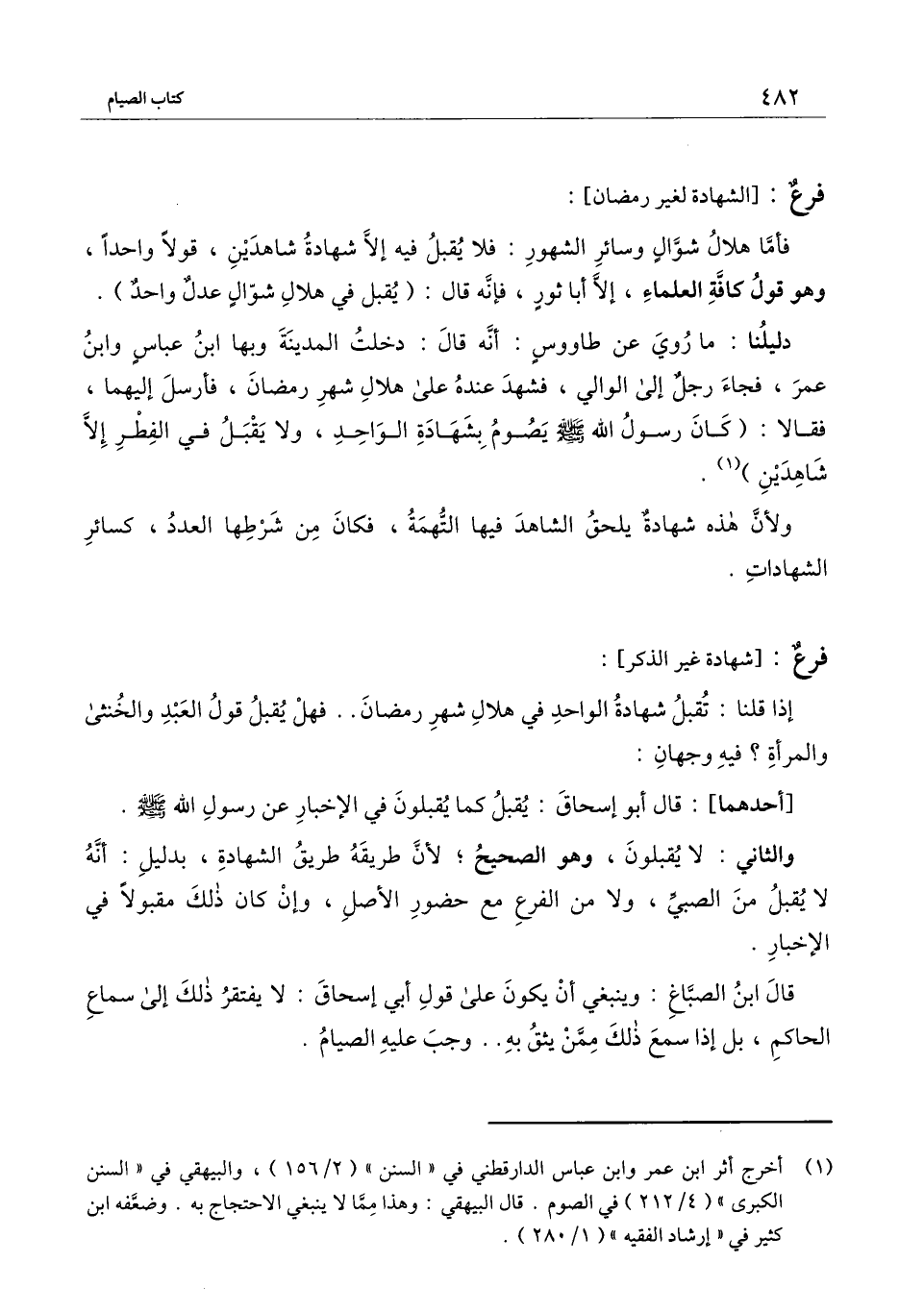 دليلنا: ما روي عن طاووس: أنه قال: دخلت المدينة وبها ابن عباس وابن عمر، فجاء رجل إلى الوالي، فشهد عنده على هلال شهر رمضان، فأرسل إليهما، فقالا «كان رسول الله - صَلَّى اللَّهُ عَلَيْهِ وَسَلَّمَ - يصوم بشهادة الواحد، ولا يقبل في الفطر إلا شاهدين» ولأن هذه شهادة يلحق الشاهد فيها التهمة، فكان من شرطها العدد، كسائر الشهادات.