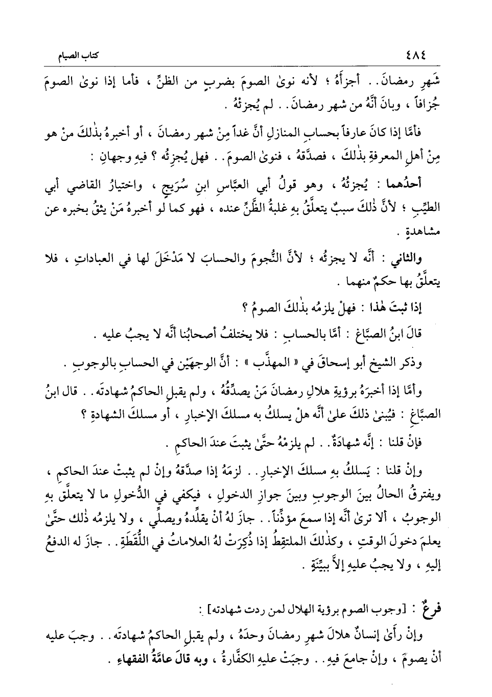 فأما إذا كان عارفًا بحساب المنازل أن غدًا من شهر رمضان، أو أخبره بذلك من هو من أهل المعرفة بذلك، فصدقه، فنوى الصوم.. فهل يجزئه؟ فيه وجهان: