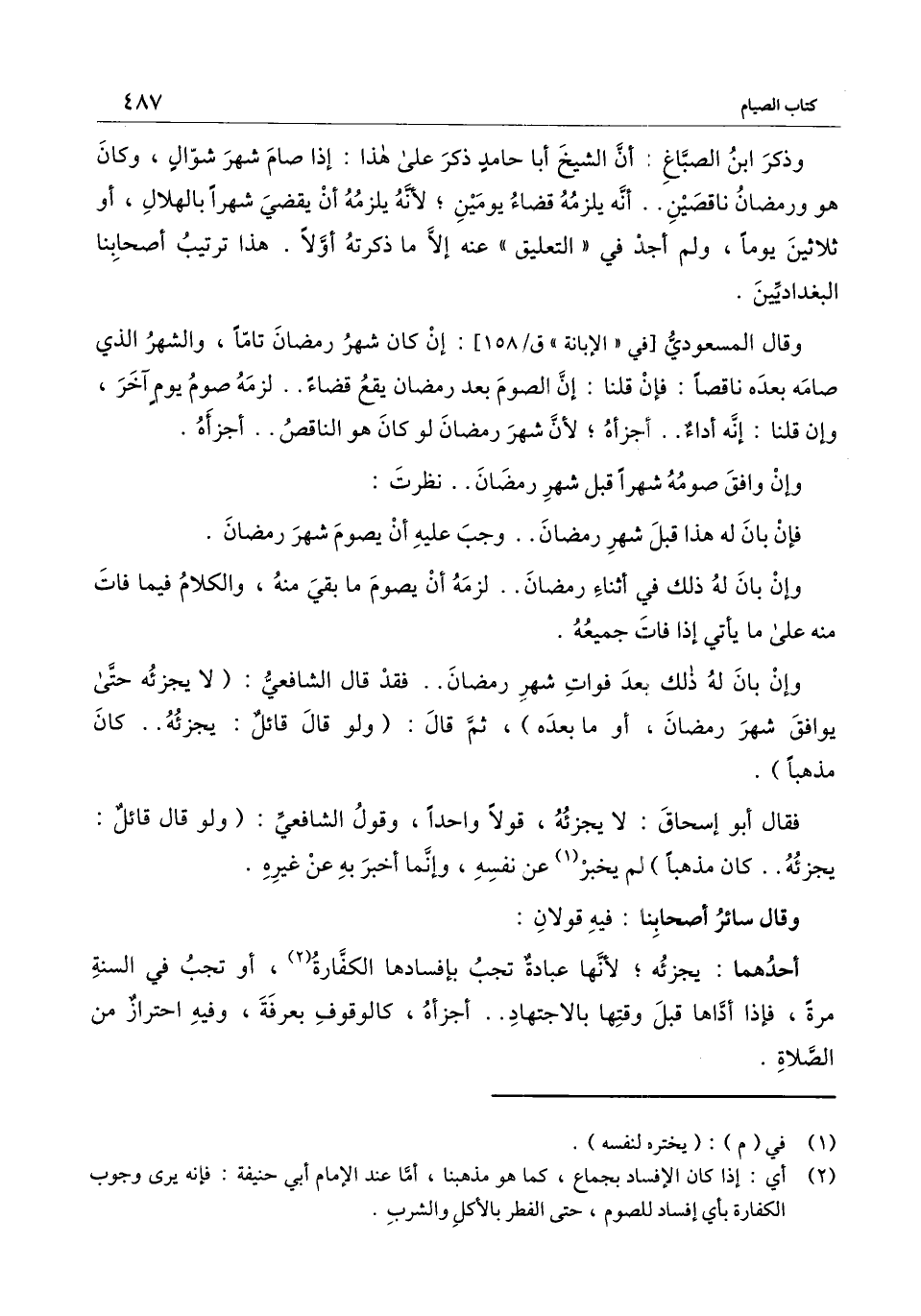 وقال المسعودي [في الإبانة \ ق\158] : إن كان شهر رمضان تامًا، والشهر الذي صامه بعده ناقصًا: فإن قلنا: إن الصوم بعد رمضان يقع قضاء.. لزمه صوم يوم آخر، وإن قلنا: إنه أداء.. أجزأه؛ لأن شهر رمضان لو كان هو الناقص.. أجزأه.