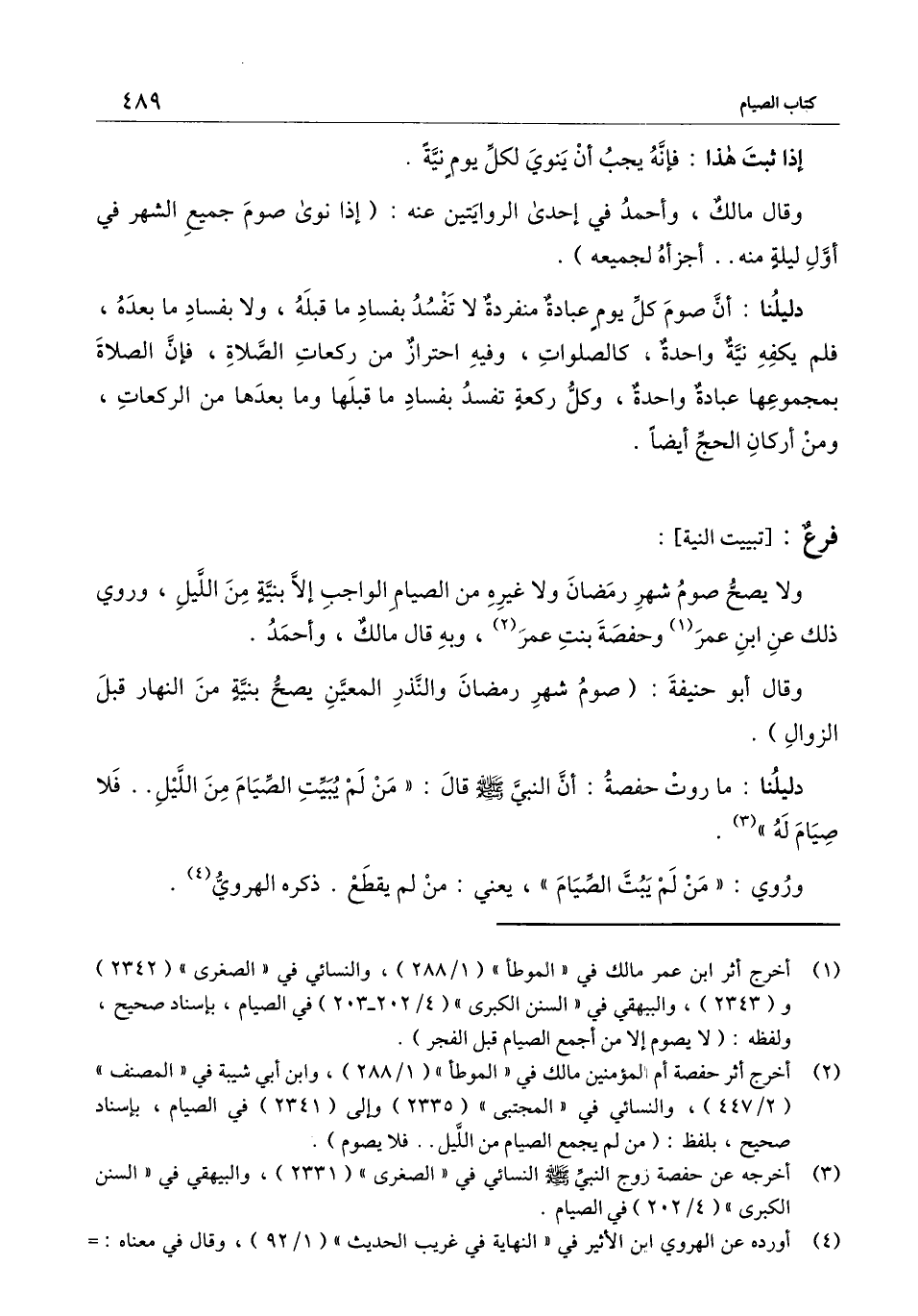 ] : ولا يصح صوم شهر رمضان ولا غيره من الصيام الواجب إلا بنية من الليل، وروي ذلك عن ابن عمر وحفصة بنت عمر، وبه قال مالك، وأحمد.