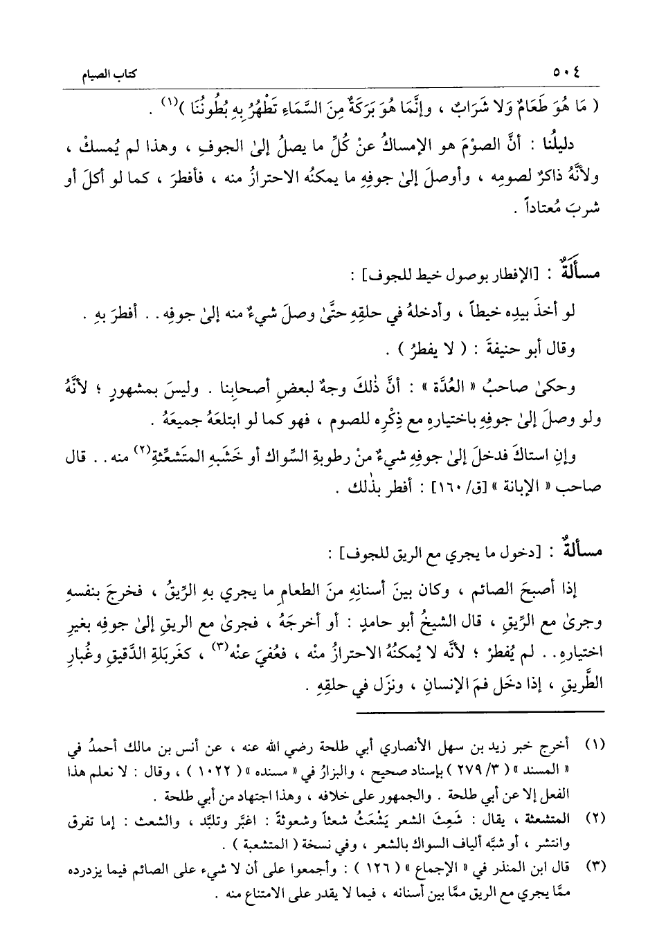 ] : لو أخذ بيده خيطًا، وأدخله في حلقة حتى وصل شيء منه إلى جوفه.. أفطر به.