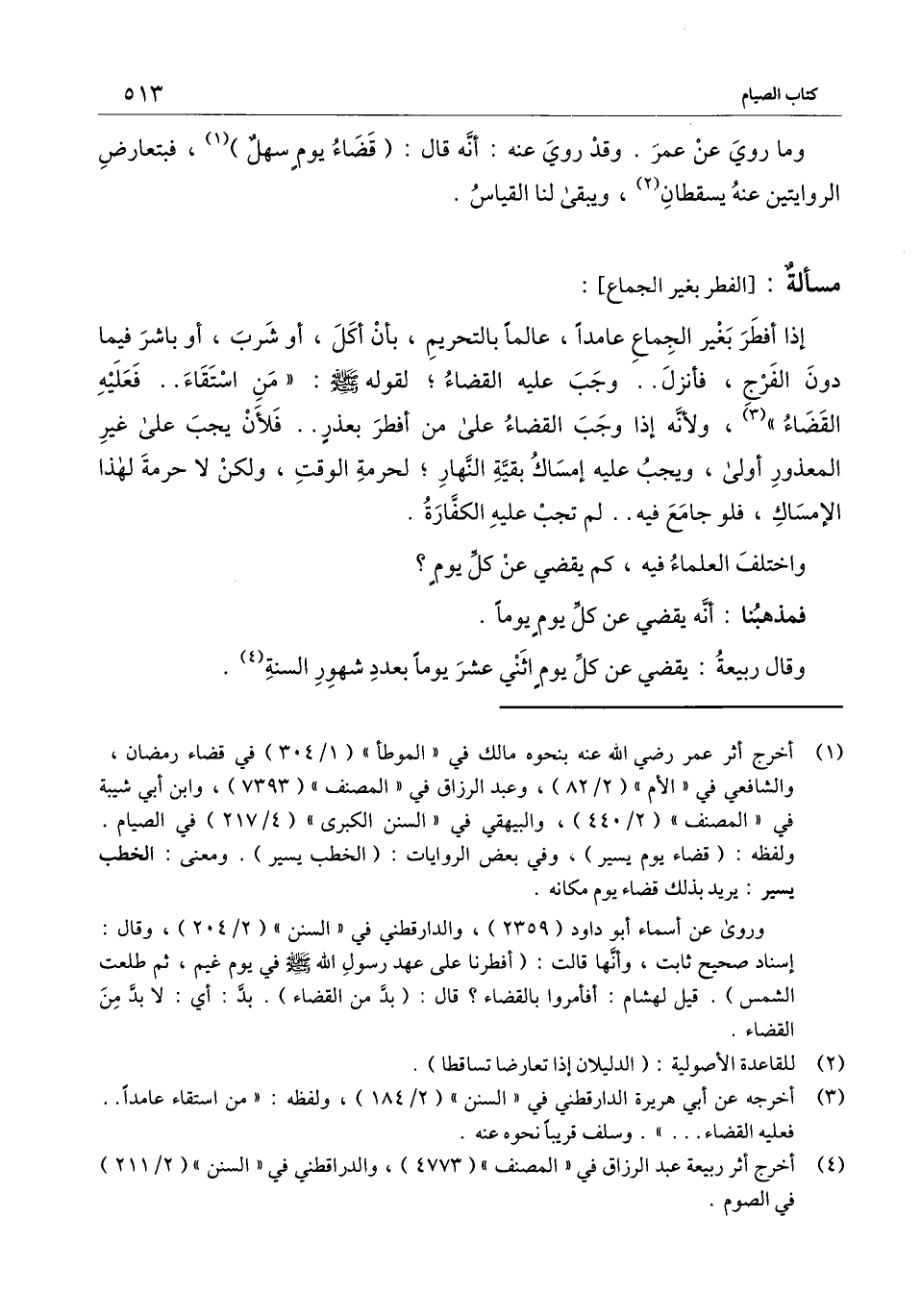 وما روي عن عمر. وقد روي عنه: أنه قال: (قضاء يوم سهل) فبتعارض الروايتين عنه يسقطان، ويبقى لنا القياس.