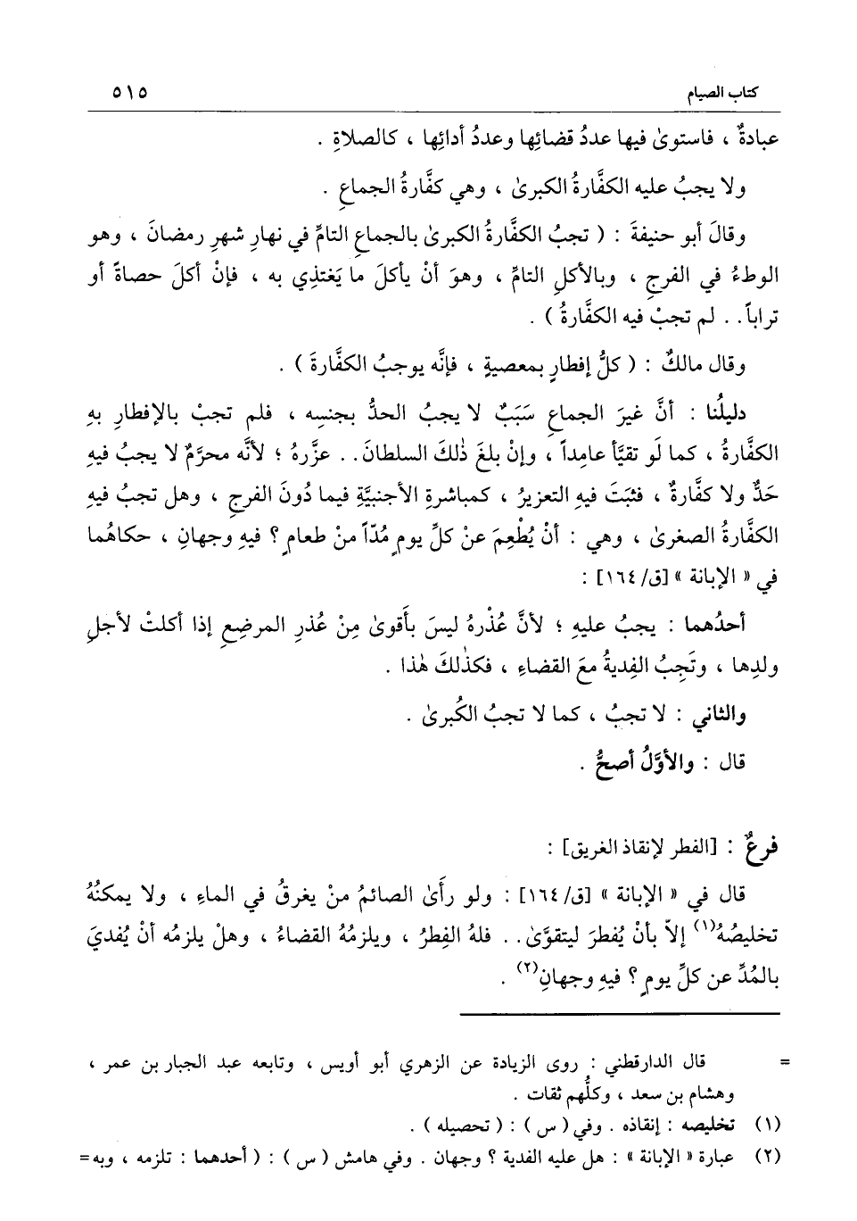] : قال في " الإبانة " [ق\164] : ولو رأى الصائم من يغرق في الماء، ولا يمكنه تخليصه إلا بأن يفطر ليتقوى.. فله الفطر، ويلزمه القضاء، وهل يلزمه أن يفدي بالمد عن كل يوم؟ فيه وجهان.