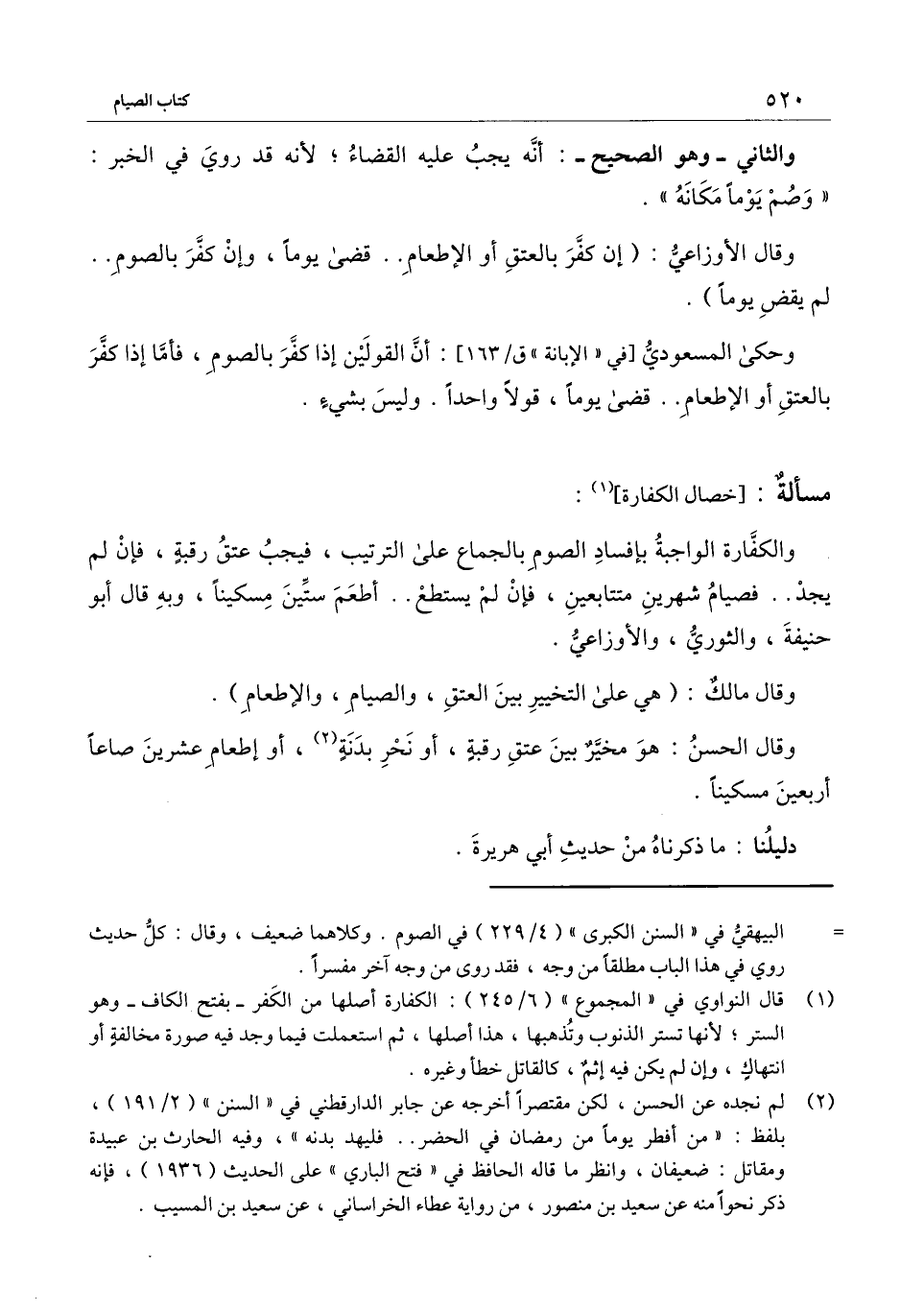 ] : والكفارة الواجبة بإفساد الصوم بالجماع على الترتيب، فيجب عتق رقبة، فإن لم يجد.. فصيام شهرين متتابعين، فإن لم يستطع.. أطعم ستين مسكيناً، وبه قال أبو حنيفة، والثوري، والأوزاعي.