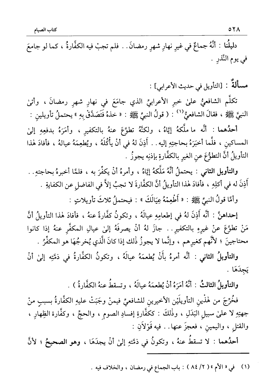 تكلم الشافعي على خبر الأعرابي الذي جامع في نهار شهر رمضان، وأتى النبي - صَلَّى اللَّهُ عَلَيْهِ وَسَلَّمَ -، فقال الشافعي: قول النبي - صَلَّى اللَّهُ عَلَيْهِ وَسَلَّمَ -: " خذه فتصدق به " يحتمل تأويلين: