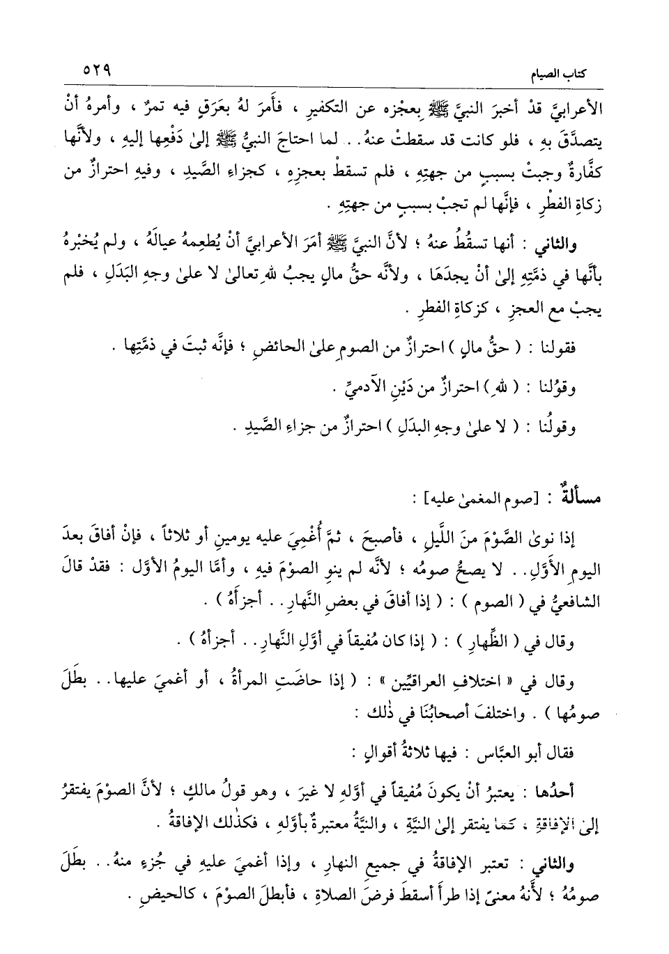 والثاني: تعتبر الإفاقة في جميع النهار، وإذا أغمي عليه في جزء منه.. بطل صومه؛ لأنه معنى إذا طرأ أسقط فرض الصلاة، فأبطل الصوم، كالحيض.