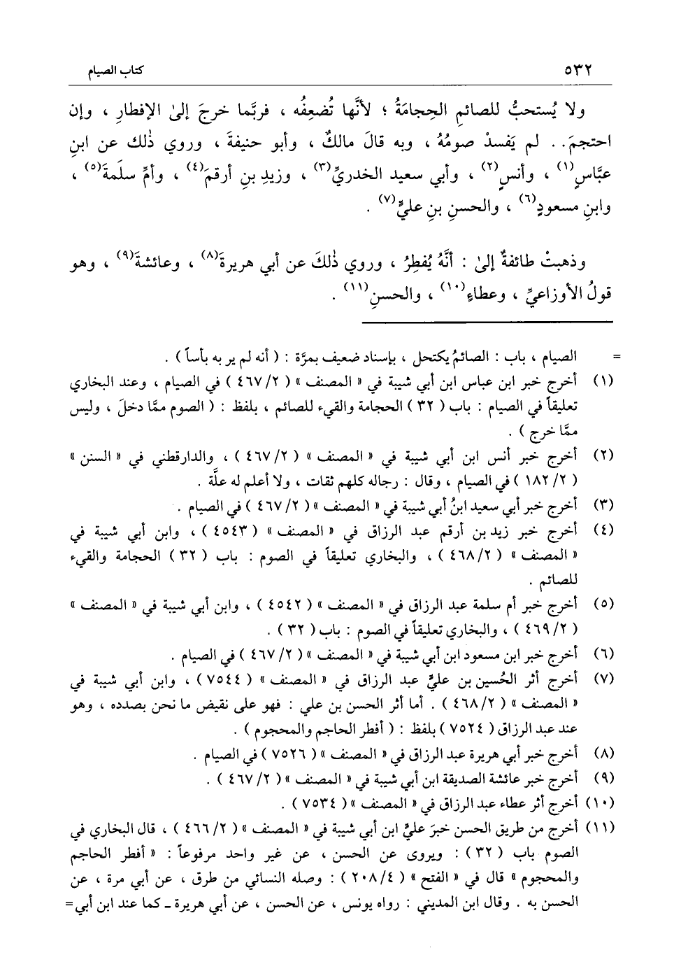 ولا يستحب للصائم الحجامة؛ لأنها تضعفه، فربما خرج إلى الإفطار وإن احتجم.. لم يفسد صومه، وبه قال مالك، وأبو حنيفة، وروي ذلك عن ابن عباس، وأنس، وأبي سعيد الخدري، وزيد بن أرقم، وأم سلمة، وابن مسعود، والحسن بن علي.