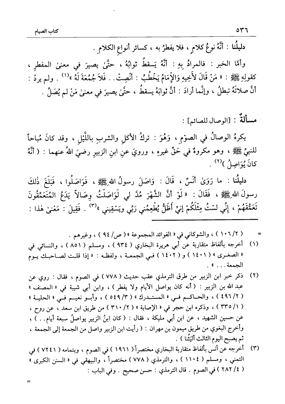 ] : يكره الوصال في الصوم، وهو: ترك الأكل والشرب بالليل، وقد كان مباحاً للنبي - صَلَّى اللَّهُ عَلَيْهِ وَسَلَّمَ -، وهو مكروه في حق غيره، وروي عن ابن الزبير - رَضِيَ اللَّهُ عَنْهُمَا - (أنه كان يواصل)