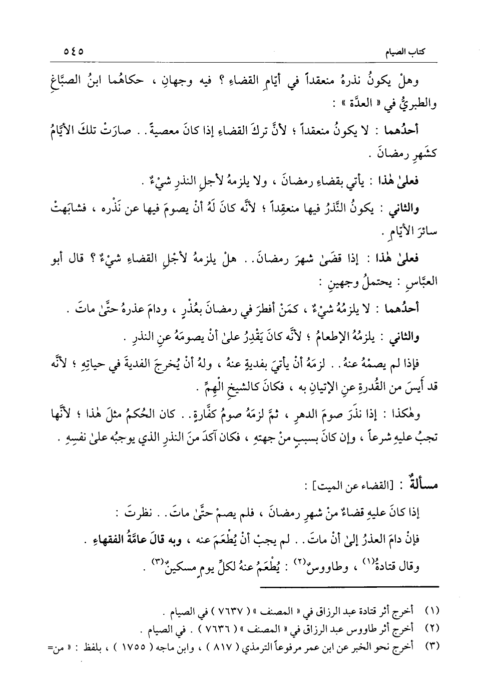 وهل يكون نذره منعقدا في أيام القضاء؟ فيه وجهان، حكاهما ابن الصباغ والطبري في " العدة ":