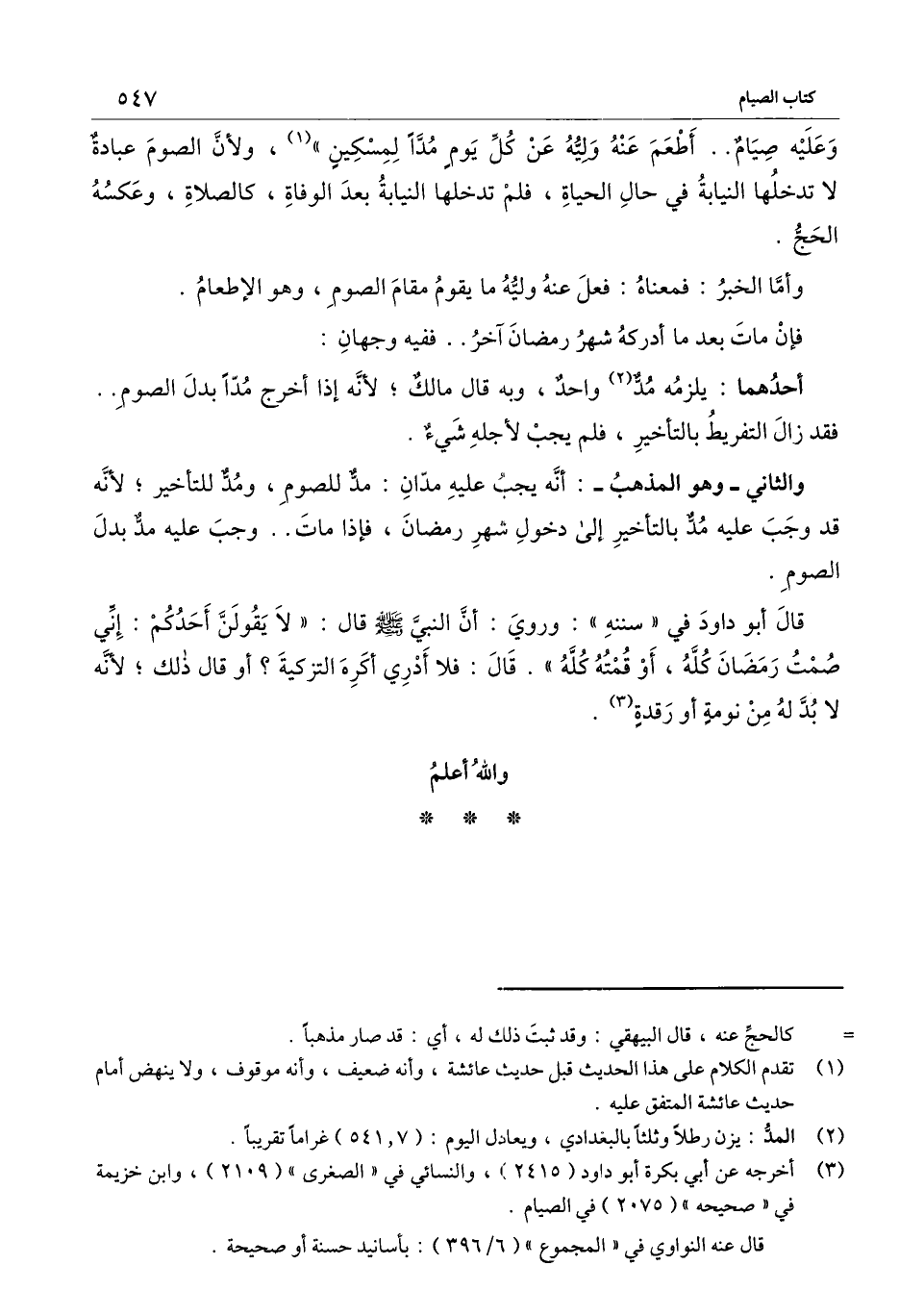 وعليه صيام.. أطعم عنه وليه عن كل يوم مداً لمسكين» ، ولأن الصوم عبادة لا تدخلها النيابة في حال الحياة، فلم تدخلها النيابة بعد الوفاة، كالصلاة، وعكسه الحج.