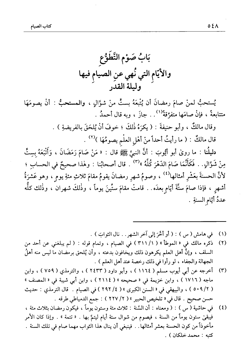 دليلنا: ما روى أبو أيوب: أن النبي - صَلَّى اللَّهُ عَلَيْهِ وَسَلَّمَ - قال: «من صام رمضان، وأتبعه بست من شوال.. فكأنما صام الدهر كله» . قال أصحابنا: وهذا صحيح في الحساب؛ لأن الحسنة بعشر أمثالها، وصوم شهر رمضان يقوم مقام ثلاثمائة يوم، وهو عشرة أشهر، فإذا صام ستة أيام بعده.. قامت مقام ستين يوماً، وذلك شهران، وذلك كله عدد أيام السنة.