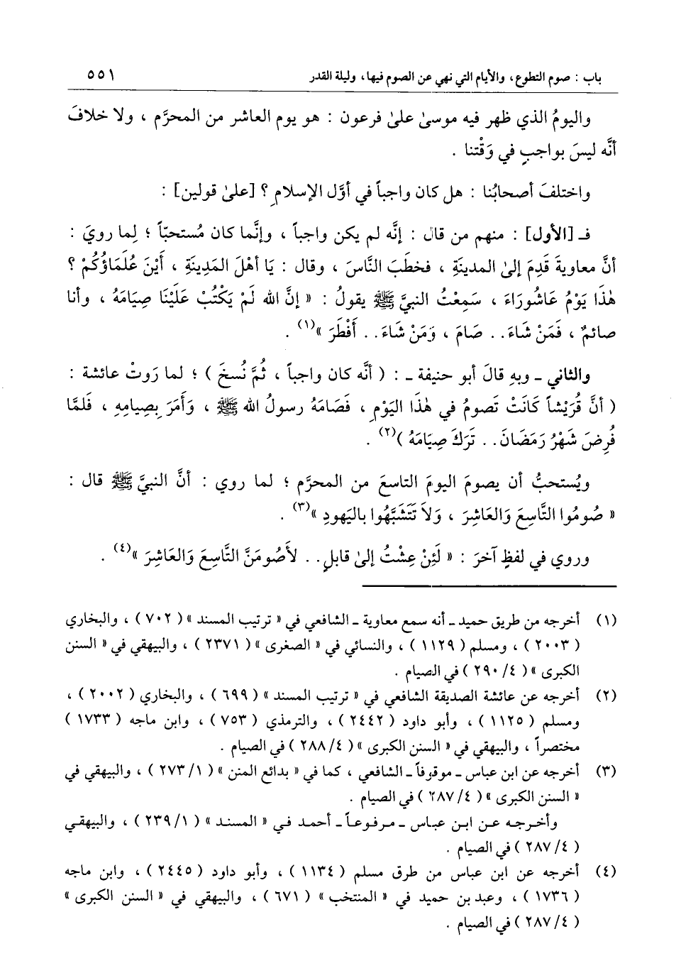 فـ[الأول] : منهم من قال: إنه لم يكن واجبا، وإنما كان مستحبا؛ لما روي: «أن معاوية قدم إلى المدينة، فخطب الناس، وقال: يا أهل المدينة، أين علماؤكم؟ هذا يوم عاشوراء، سمعت النبي - صَلَّى اللَّهُ عَلَيْهِ وَسَلَّمَ - يقول: "إن الله لم يكتب علينا صيامه، وأنا صائم، فمن شاء.. صام، ومن شاء.. أفطر» .