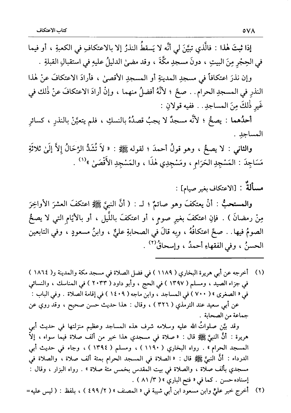 إذا ثبت هذا: فالذي تبين لي أنه لا يسقط النذر إلا بالاعتكاف في الكعبة، أو فيما في الحجر من البيت، دون مسجد مكة، وقد مضى الدليل عليه في استقبال القبلة.