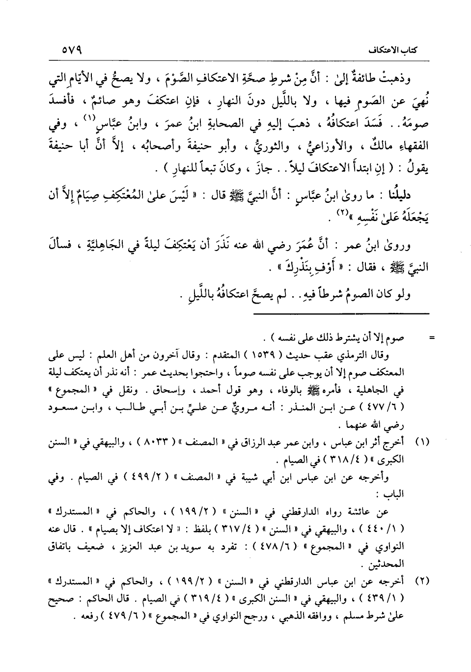 دليلنا: ما روى ابن عباس: أن النبي - صَلَّى اللَّهُ عَلَيْهِ وَسَلَّمَ - قال: «ليس على المعتكف صيام إلا أن يجعله على نفسه» وروى ابن عمر: «أن عمر - رَضِيَ اللَّهُ عَنْهُ - نذر أن يعتكف ليلة في الجاهلية، فسأل النبي - صَلَّى اللَّهُ عَلَيْهِ وَسَلَّمَ -، فقال: "أوف بنذرك» .