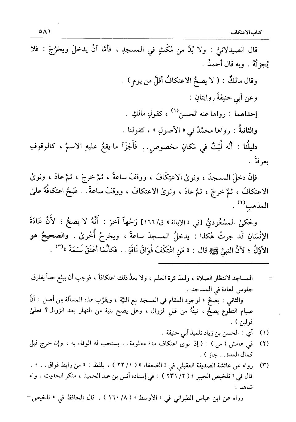 وحكى المسعودي [في " الإبانة " ق\166] وجها آخر: أنه لا يصح؛ لأن عادة الإنسان قد جرت هكذا: يدخل المسجد ساعة، ويخرج أُخرى. والصحيح هو الأول؛ لأن النبي - صَلَّى اللَّهُ عَلَيْهِ وَسَلَّمَ - قال: «من اعتكف فواق ناقة.. فكأنما أعتق نسمة»