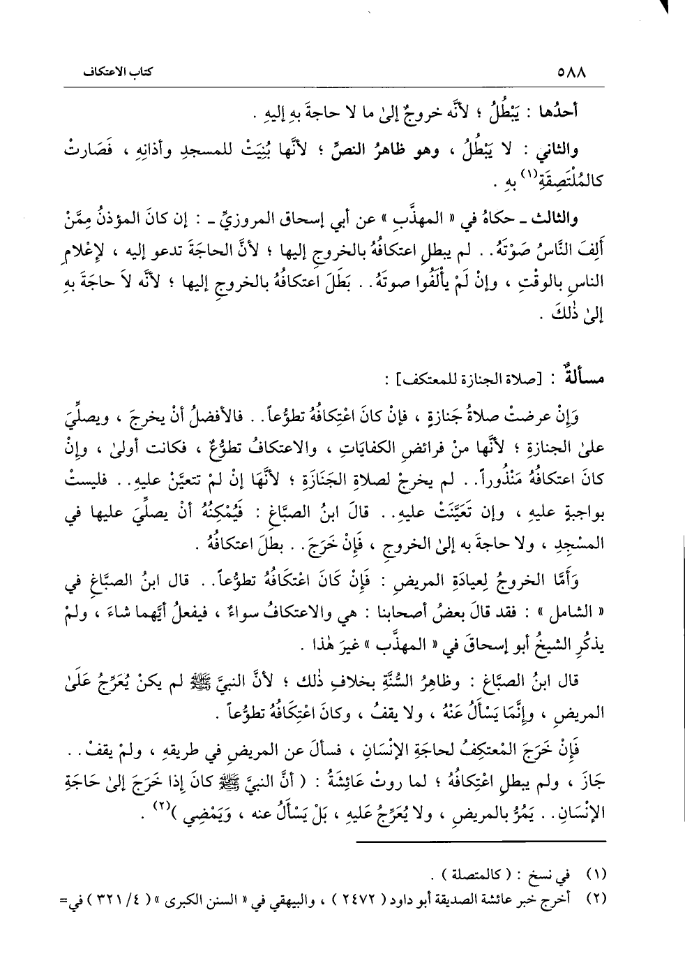 ] : وإن عرضت صلاة جنازة، فإن كان اعتكافه تطوعاً.. فالأفضل أن يخرج، ويصلي على الجنازة؛ لأنها من فرائض الكفايات، والاعتكاف تطوع، فكانت أولى، وإن كان اعتكافه منذوراً.. لم يخرج لصلاة الجنازة؛ لأنها إن لم تتعين عليه.. فليست بواجبة عليه، وإن تعينت عليه.. قال ابن الصباغ: فيمكنه أن يصلي عليها في المسجد، ولا حاجة به إلى الخروج، فإن خرج.. بطل اعتكافه.
