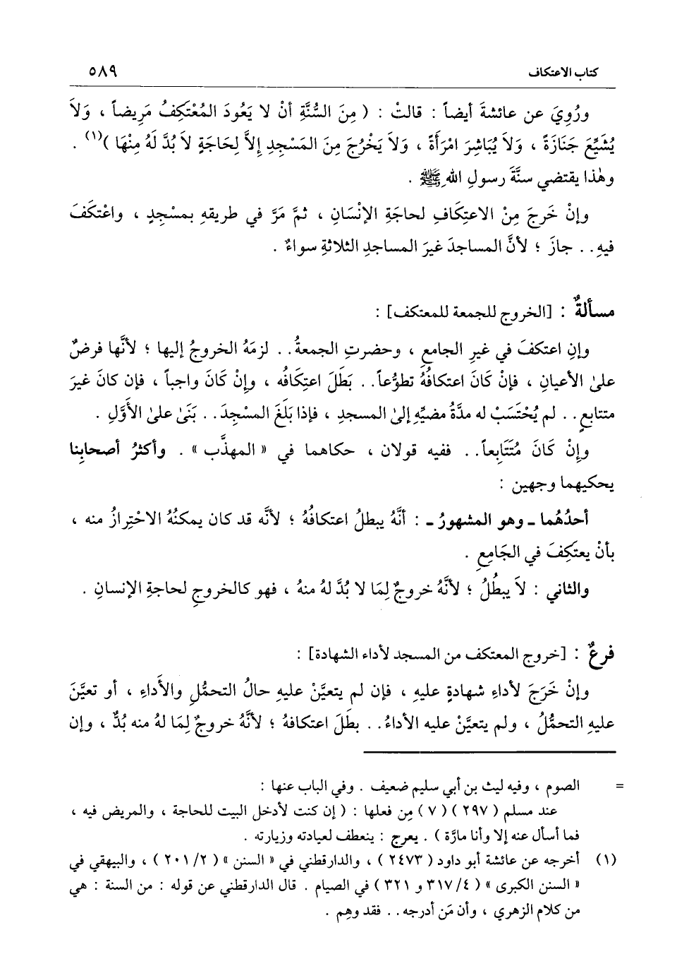 وروي عن عائشة أيضاً: قالت «من السنة أن لا يعود المعتكف مريضاً، ولا يشيع جنازة، ولا يباشر امرأة، ولا يخرج من المسجد إلا لحاجة لا بد له منها»