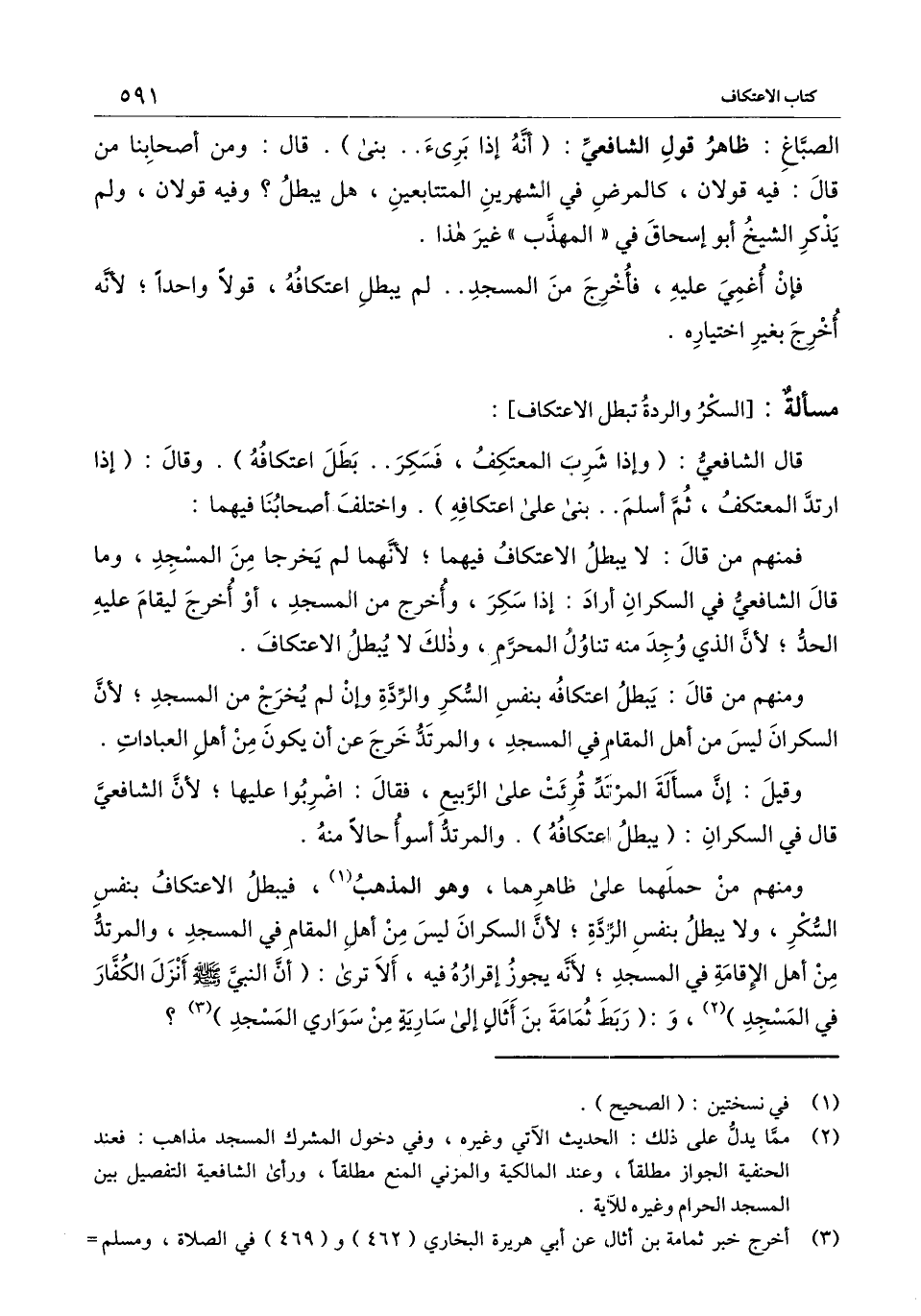 ومنهم من حملهما على ظاهرهما، وهو المذهب، فيبطل الاعتكاف بنفس السكر ولا يبطل بنفس الردة؛ لأن السكران ليس من أهل المقام في المسجد، والمرتد من أهل الإقامة في المسجد؛ لأنه يجوز إقراره فيه، ألا ترى: (أن النبي - صَلَّى اللَّهُ عَلَيْهِ وَسَلَّمَ - أنزل الكفار في المسجد) ، و: (ربط ثمامة بن أثال إلى سارية من سواري المسجد) ؟