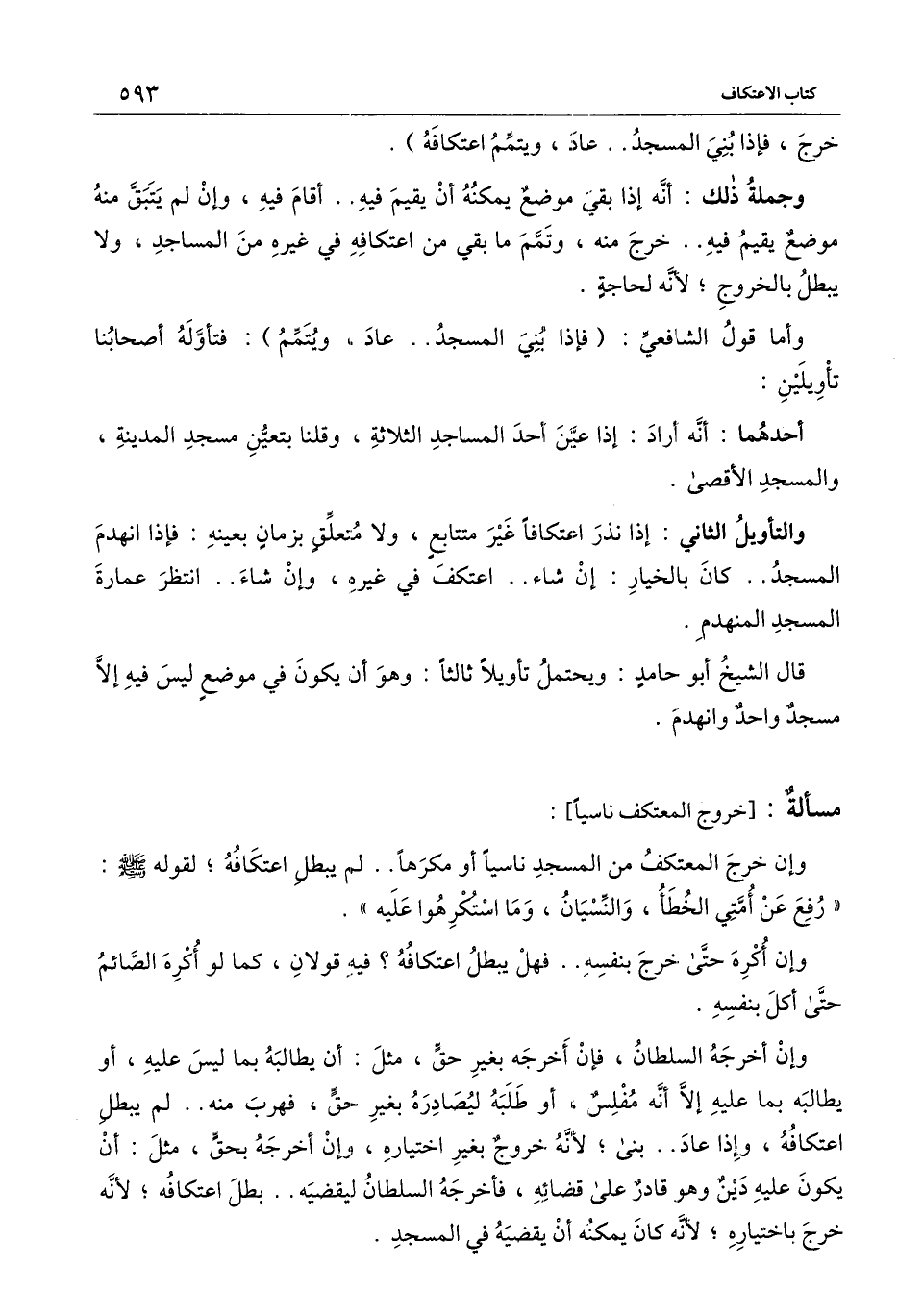 خرج، فإذا بني المسجد.. عاد، ويتمم اعتكافه) .