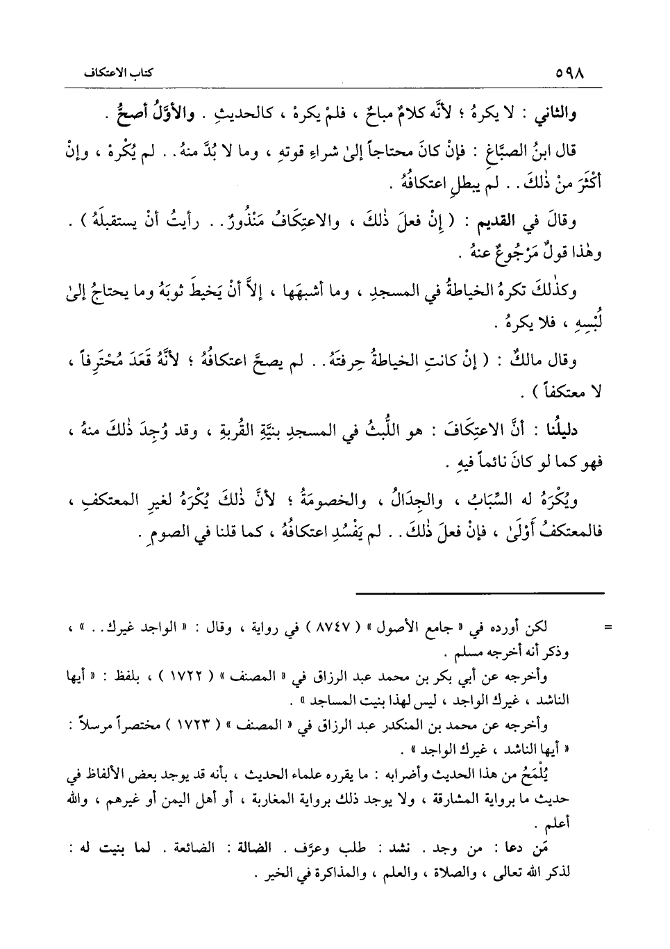 وكذلك تكره الخياطة في المسجد، وما أشبهها، إلا أن يخيط ثوبه وما يحتاج إلى لبسه، فلا يكره.