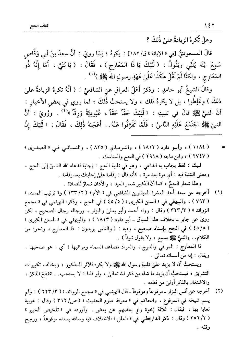 قال المسعودي [في " الإبانة " ق\ 182] : يكره؛ لما روي: «أن سعد بن أبي وقاص سمع ابنه يلبي ويقول: (لبيك يا ذا المعارج) ، فقال: (يا بني، أما إنه ذو المعارج، ولكنا لم نقل هكذا على عهد رسول الله - صَلَّى اللَّهُ عَلَيْهِ وَسَلَّمَ -»