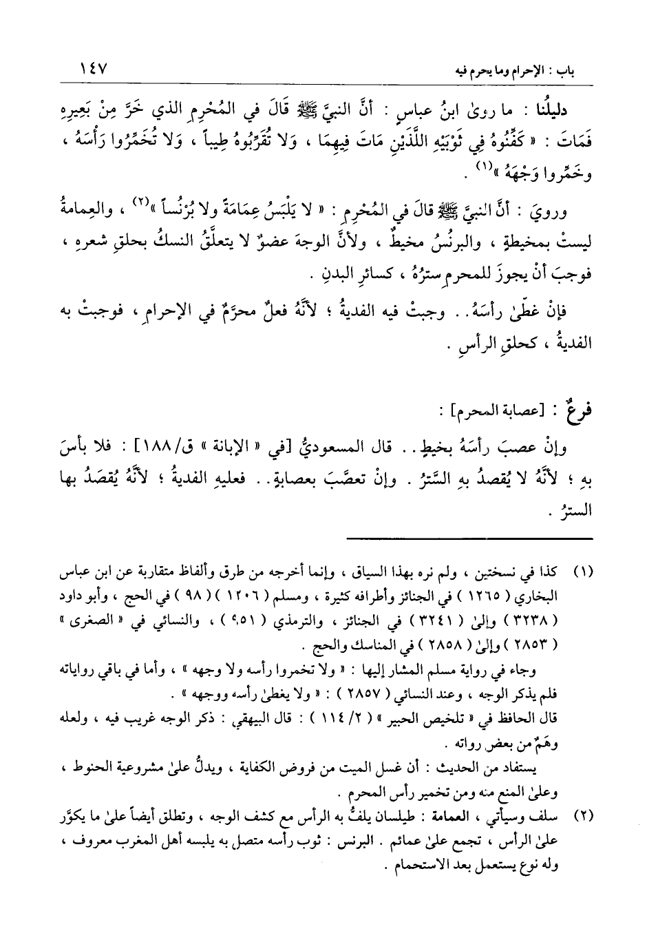 وروي: أن النبي - صَلَّى اللَّهُ عَلَيْهِ وَسَلَّمَ - قال في المحرم: «لا يلبس عمامة ولا برنسا» ، والعمامة ليست بمخيطة، والبرنس مخيط، ولأن الوجه عضو لا يتعلق النسك بحلق شعره، فوجب أن يجوز للمحرم ستره، كسائر البدن.