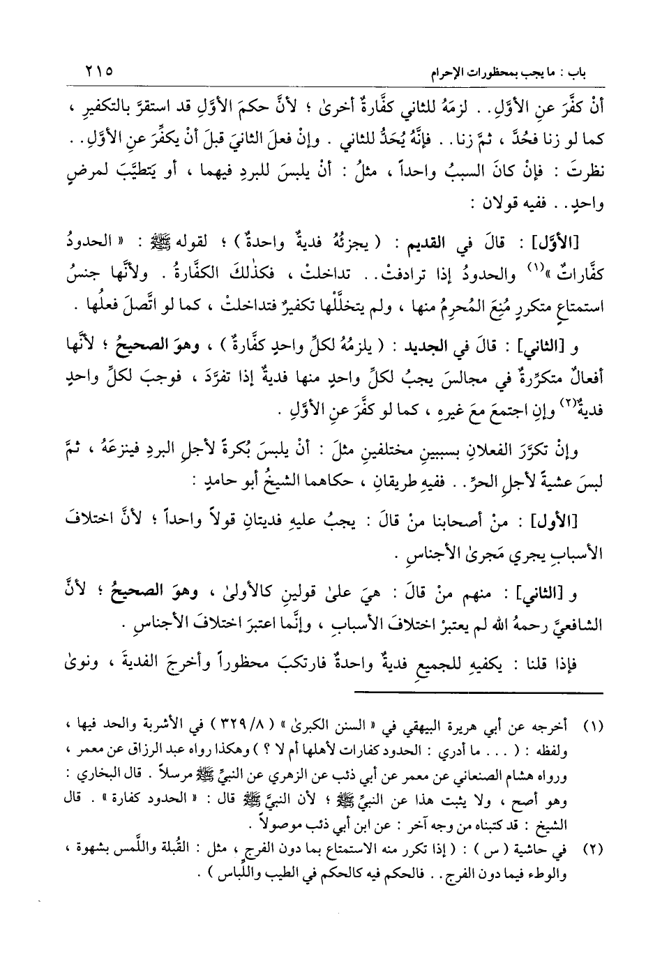 أن كفر عن الأول.. لزمه للثاني كفارة أخرى؛ لأن حكم الأول قد استقر بالتكفير كما لو زنا فحد، ثم زنا.. فإنه يحد للثاني. وإن فعل الثاني قبل أن يكفر من الأول نظرت: فإن كان السبب واحدا، مثل: أن يلبس للبرد فيهما، أو يتطيب لمرض واحد.. ففيه قولان: