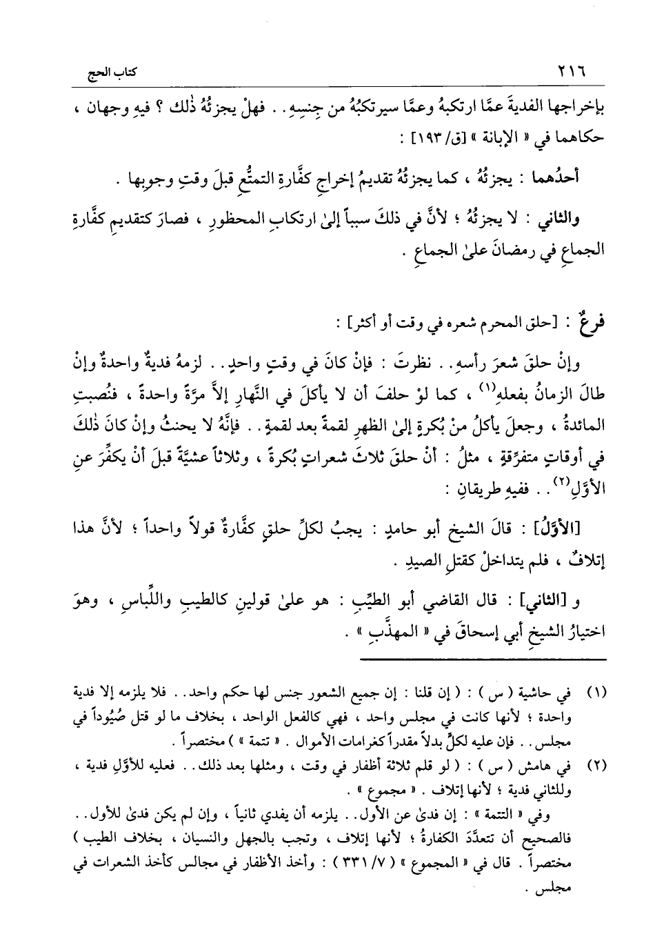 وإن حلق شعر رأسه.. نظرت: فإن كان في وقت واحد.. لزمه فدية واحدة وإن طال الزمان بفعله، كما لو حلف أن لا يأكل في النهار إلا مرة واحدة، فنصبت المائدة، وجعل يأكل من بكرة إلى الظهر لقمة بعد لقمة.. فإنه لا يحنث وإن كان ذلك في أوقات متفرقة، مثل: أن حلق ثلاث شعرات بكرة، وثلاثا عشية قبل أن يكفر عن الأول. ففيه طريقان:
