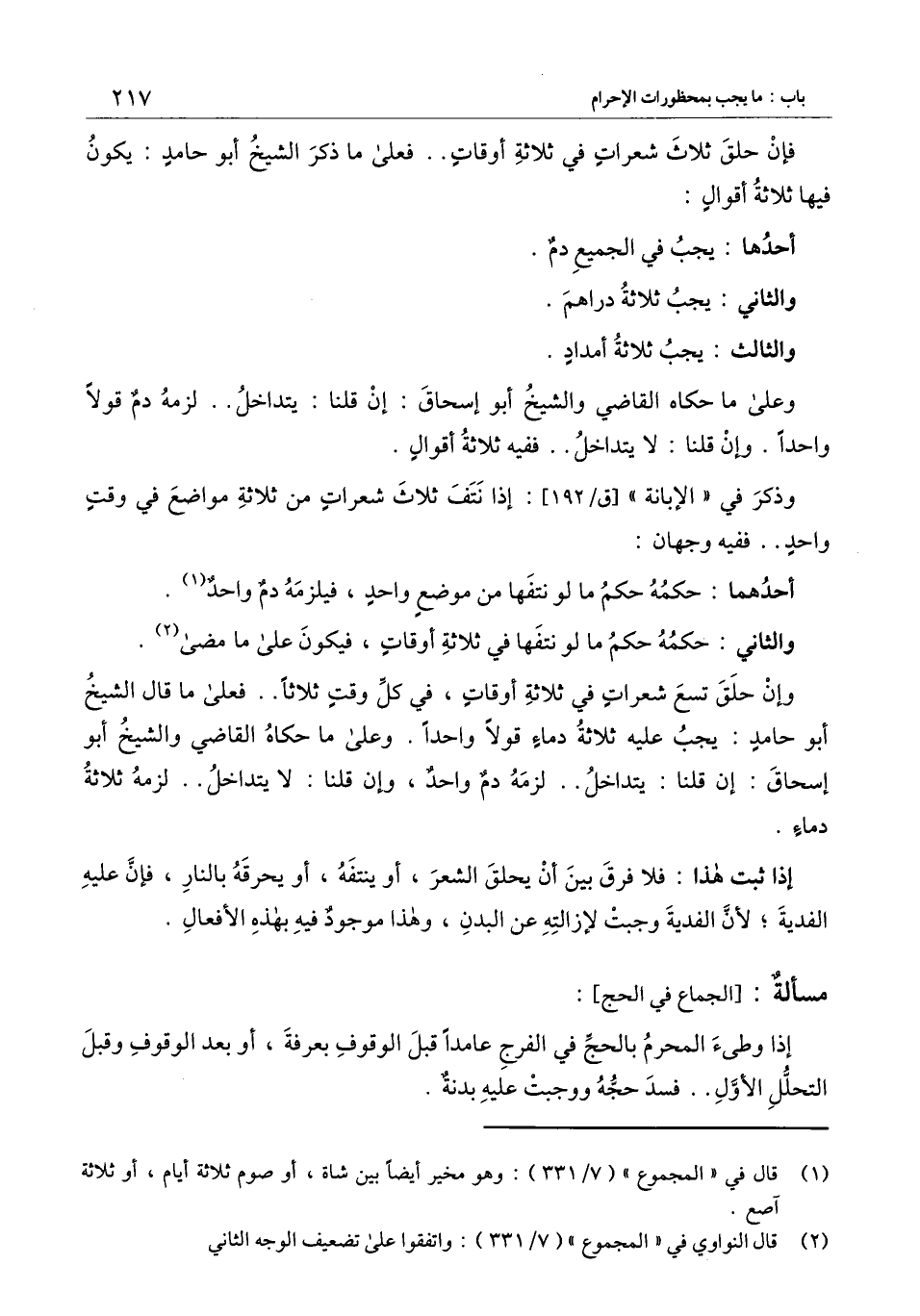 وإن حلق تسع شعرات في ثلاثة أوقات، في كل وقت ثلاثا.. فعلى ما قال الشيخ أبو حامد: يجب عليه ثلاثة دماء قولا واحدا. وعلى ما حكاه القاضي والشيخ أبو إسحاق: إن قلنا: يتداخل.. لزمه دم واحد، وإن قلنا: لا يتداخل.. لزمه ثلاثة دماء.